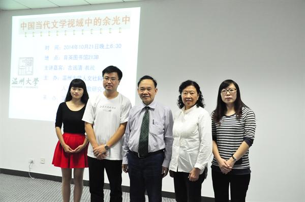 孙良好副院长首先致辞,他对古远清教授来到温大和同学们畅聊余光中及其作品表示热烈欢迎,并向同学们解释这个特殊的日子也是余光中先生86岁生日,借由此次活动隔海向余光中先生致敬,并感谢余老先生对中国当代文学做出的巨大贡献。接着,人文社科处潘从义老师致辞。潘老师简单介绍了我校人文沙龙的发展,并指出人文沙龙的举办旨在激发研究生们与国内外知名学者、作家的不同视角的碰撞,促进了自由探究的学术氛围,并预祝此次活动圆满成功。