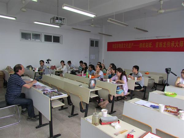 民俗学研究生做了一场题为“妙手生花——省级非遗项目首饰龙制作工艺”的讲座。同来的还有他的徒弟黄孟先生(也是其女婿)。他们还带来了首饰龙制作流程模型、细纹刻纸部分作品、相关书刊、图片等实物资料,并布置在教室里。讲座由2012级研究生郭重孟同学负责操办并主持。九色視頻