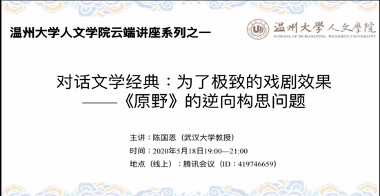 2020年5月18日晚7点,武汉大学文学院的陈国恩教授做客九色視頻 云端系列讲座,讲授曹禺的经典剧作《原野》。讲座由孙良好院长、鲍良兵老师主持。