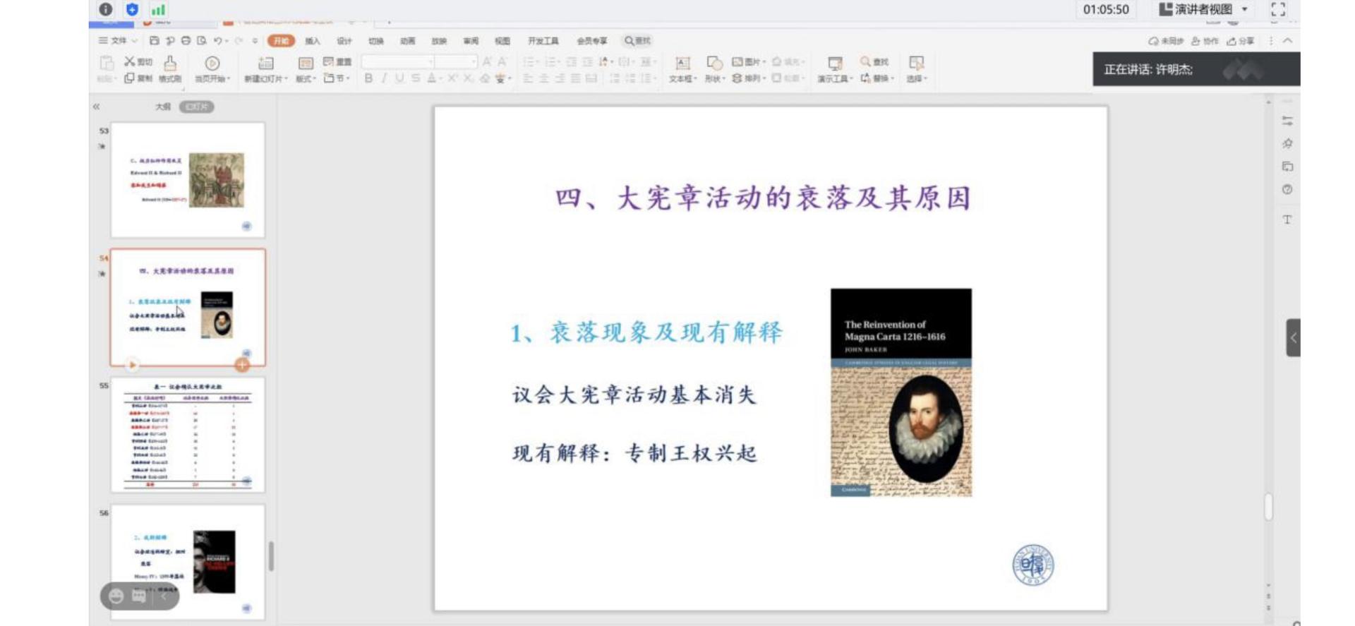 许老师在讲座开始先向我们介绍了他目前以中世纪英格兰会议中的大宪章和王权变化为主题的研究方向,随后用“大宪章恰似维苏威火山”这一生动的比喻以及威廉·斯塔布斯的“整个英格兰宪政史不过是大宪章的一部评注”这句话将讲座引入关于英格兰大宪章学术史的部分。在这一部分,许老师首先说明了大宪章在政治生活中作为王国法律的作用,尤其强调了这部在国王与议会协商下所创立起的大宪章曾经历过几位国王的数十次确认。对此现象,辉格派史学家多将其解读为国王处于法律之下的主要标志,这种观点至少在20世纪初仍颇具影响。于此相对,以John Baker为代表的另一些学者则认为,辉格史学所塑造的不过是一个“大宪章的神话”,历次对该文件的确认实际上正表明了大宪章在英格兰的政治中所起到的作用是有限的。