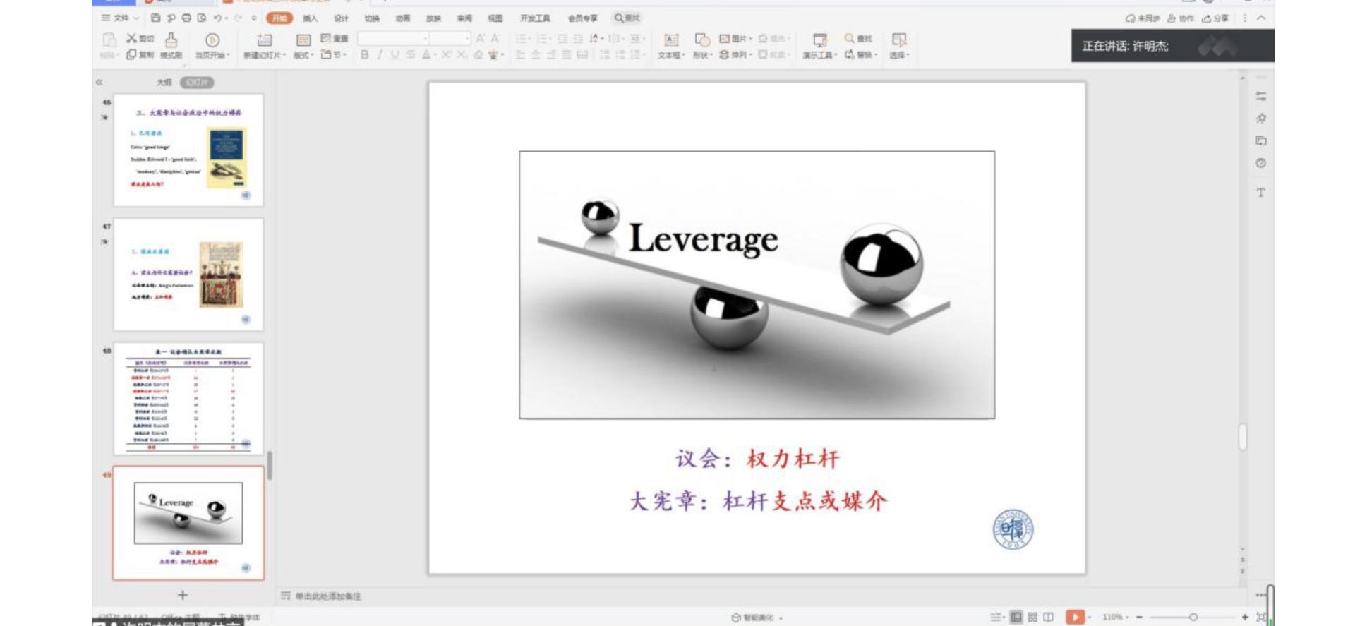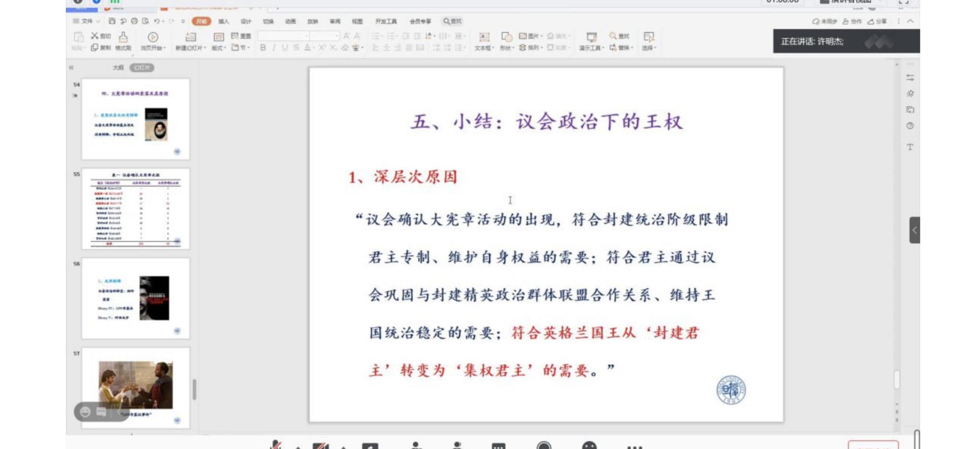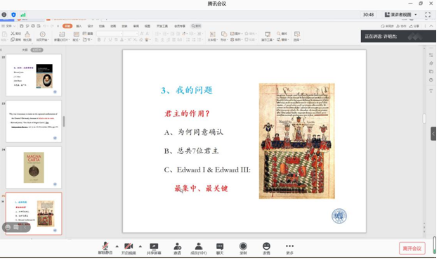 在讲座的最后,许老师就议会下的王权变化这一问题做了总结,认为议会确认大宪章活动是由于其既符合封建统治阶级限制王权专制,维护自身权益,又能增进国王与贵族的合作,维护王国统治稳定;除此之外,对于国王来说,这些确认还有利于加强君主的集权统治。因此,大宪章的确认活动带来的是一种妥协式的集权君主,在王权历史发展的大趋势中,这也是君主无奈下的最优选择。