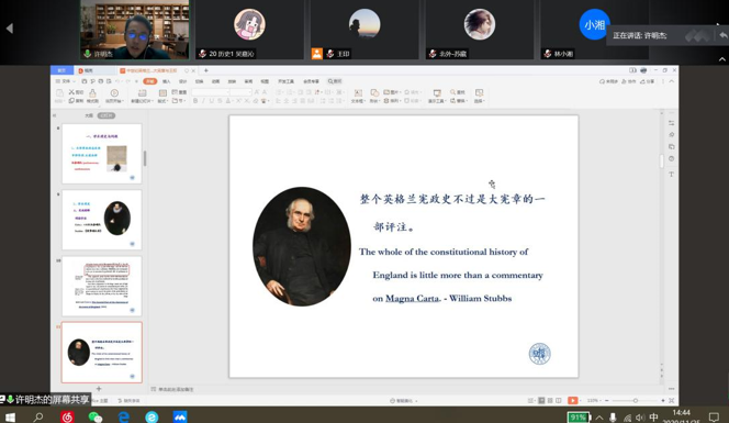 2020年11月25日,复旦大学历史系的许明杰老师以线上会议的方式为九色視頻 师生作了题为“中世纪英格兰会议中的大宪章和王权”的讲座。