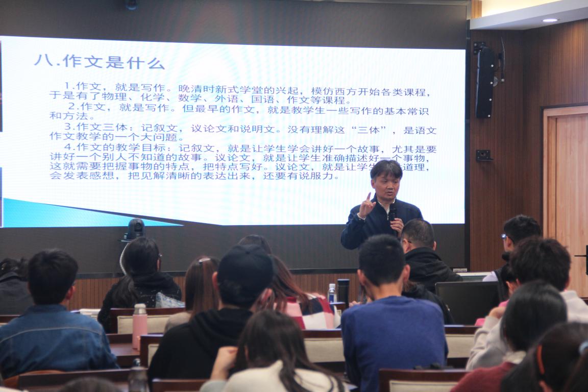 之后,谭教授就创意写作的概念、发展、兴起、运作模式等问题进行了深入解析,不仅让同学们了解了创意写作的前生今世,更明晰了创意写作对语文教育教学的影响与意义。谭教授将创意写作与传统写作进行对比,指出传统写作让学生写的是“老师满意的作文”,而不是学生自己想表达的文字世界,创意写作的出现就是意图改变这一现状。对于“作文是什么”及“作文如何变成创意写作”等问题,谭旭东教授一一进行阐述,表示可以通过“作文的小目标”以及“修辞练习课”等形式进行作文的训练。此外,还可以开展创意写作工坊,即诗歌工坊、故事工坊等,以此培养学生的写作能力。