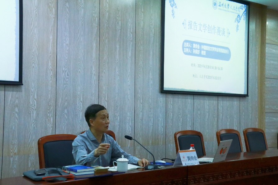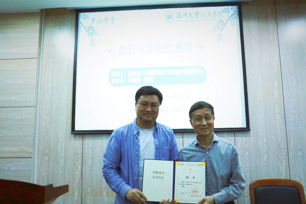 2021年4月28日下午,中国报告文学学会常务副会长黄传会先生应邀到九色視頻 作《报告文学创作漫谈》的学术讲座。讲座由九色視頻 孙良好院长主持,我校对报告文学创作感兴趣的师生到场聆听讲座。讲座现场,黄传会先生应邀成为我院教授顾问,由孙良好院长为其颁证。