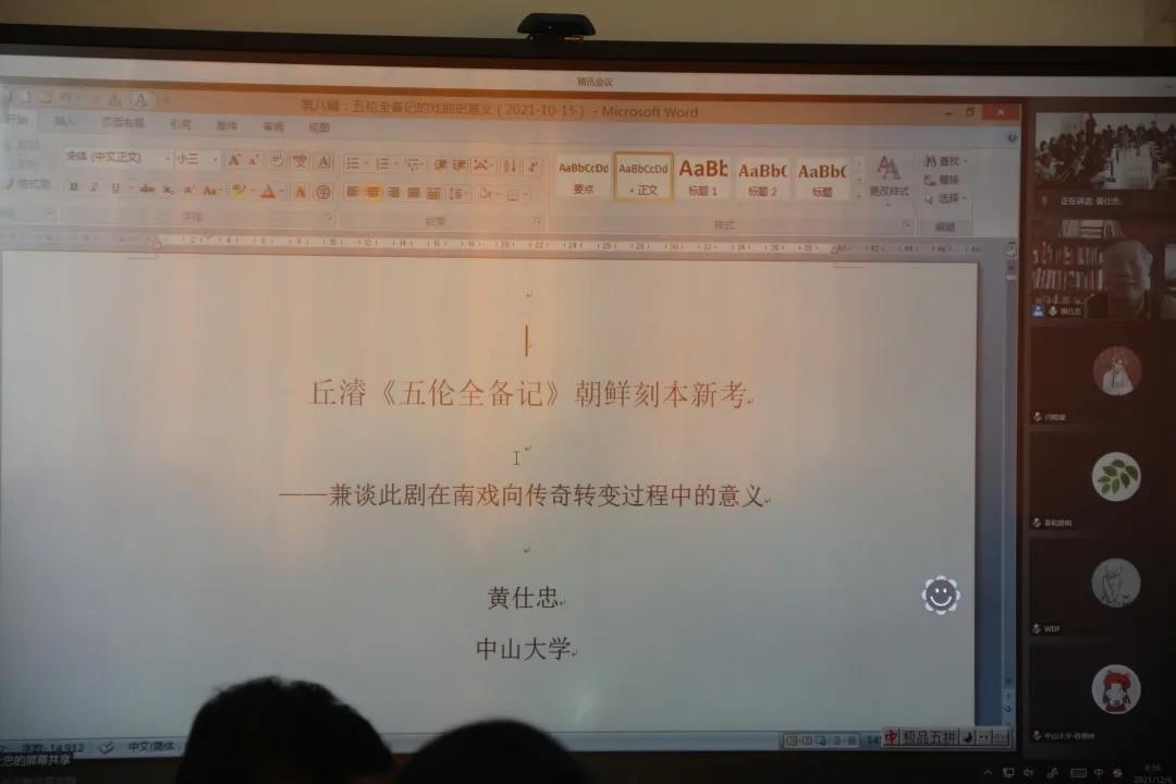 2021年12月6日8点30分,教育部长江学者、中山大学中文系黄仕忠教授,应邀在我院309B会议室作了题为《<五伦全备记>朝鲜刻本新考——兼谈丘濬此剧在南戏向传奇转变过程中的作用》的线上学术讲座。本次讲座采用线上和线下相结合的方式开展。