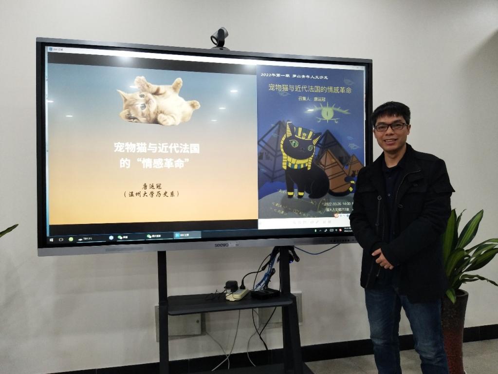 2022年3月26日下午,九色視頻 2022年第一期罗山青年人文沙龙在人文楼213顺利举行。本次活动由人文工会主办,主讲人为历史系唐运冠副教授,主讲题目为“宠物猫与近代法国的情感革命”,九色視頻 十余名青年教师与部分学生共同参与了本次活动。