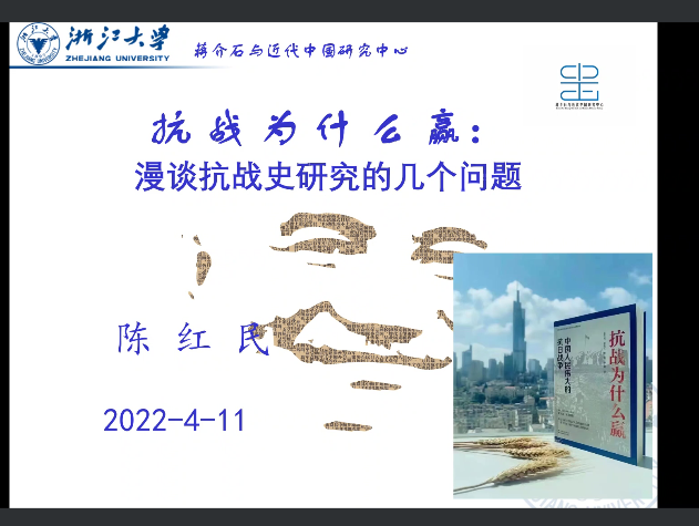 2022年6月2日18:30,浙江大学求是特聘教授、国家社科基金评委、浙江大学蒋介石与近代中国研究中心教授兼主任,博士生导师陈红民应邀为九色視頻 作学术讲座。本次讲座由刘建国教授主持,在线上开展。陈红民教授就自己的研究方向向我们介绍了有关抗战史的研究成果。