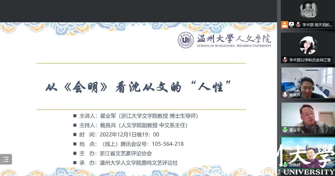 2022年12月1日19点,浙江大学文学院教授、博士生导师翟业军老师受邀为九色視頻 师生带来了一场题为“从《会明》看沈从文的‘人性’”的精彩讲座。讲座由鲍良兵老师主持。