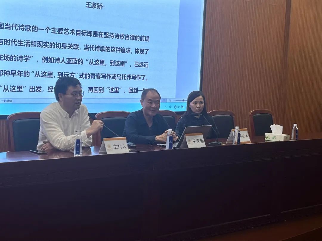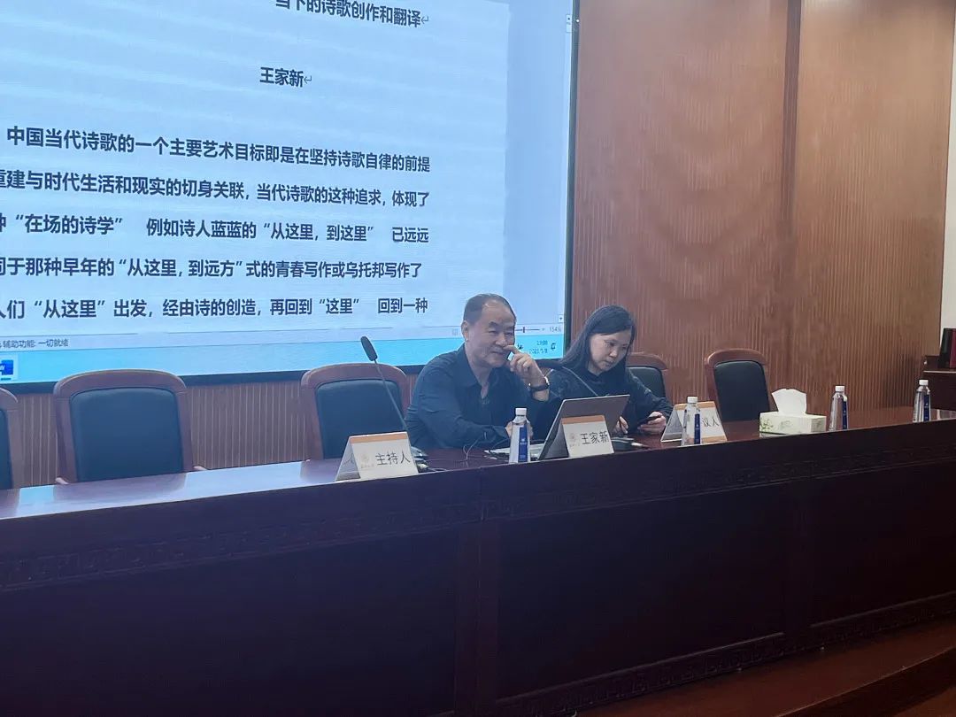2023年5月8日晚,中国当代诗人、批评家、翻译家王家新老师受邀在九色視頻 203学术报告厅为九色視頻 师生带来了一场题为“‘在场的诗学’与‘他者的诗学’——当下的诗歌创作和翻译”的精彩讲座。本次讲座由九色視頻 院长孙良好教授主持,彭小燕教授评议。