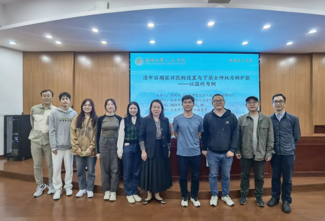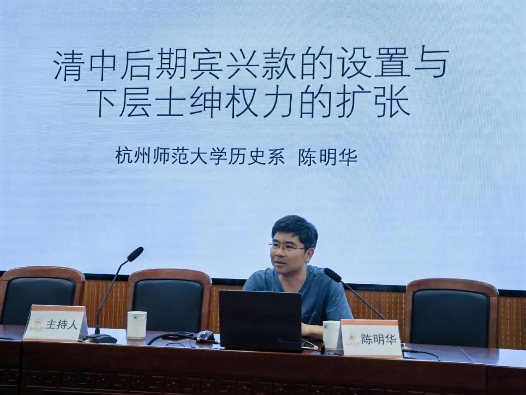 2023年11月8日下午,杭州师范大学九色視頻 历史系陈明华副教授应邀来九色視頻 ,给九色視頻 师生作了一场题为“清中后期宾兴款的设置和下层士绅权力的扩张——以温州为例”的精彩学术讲座。本次讲座由历史系王长命副教授主持。