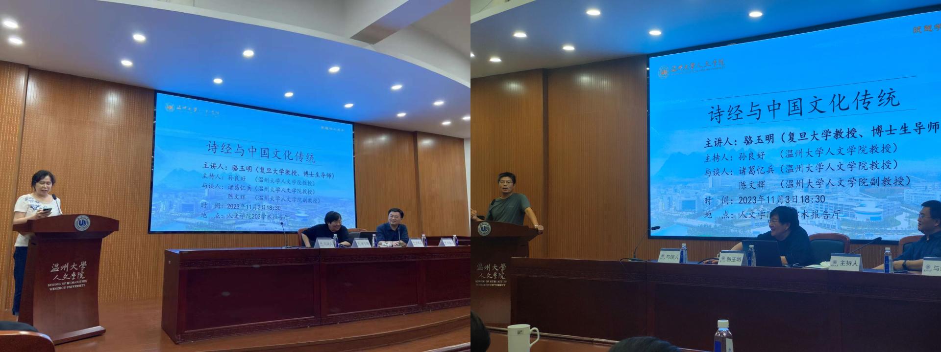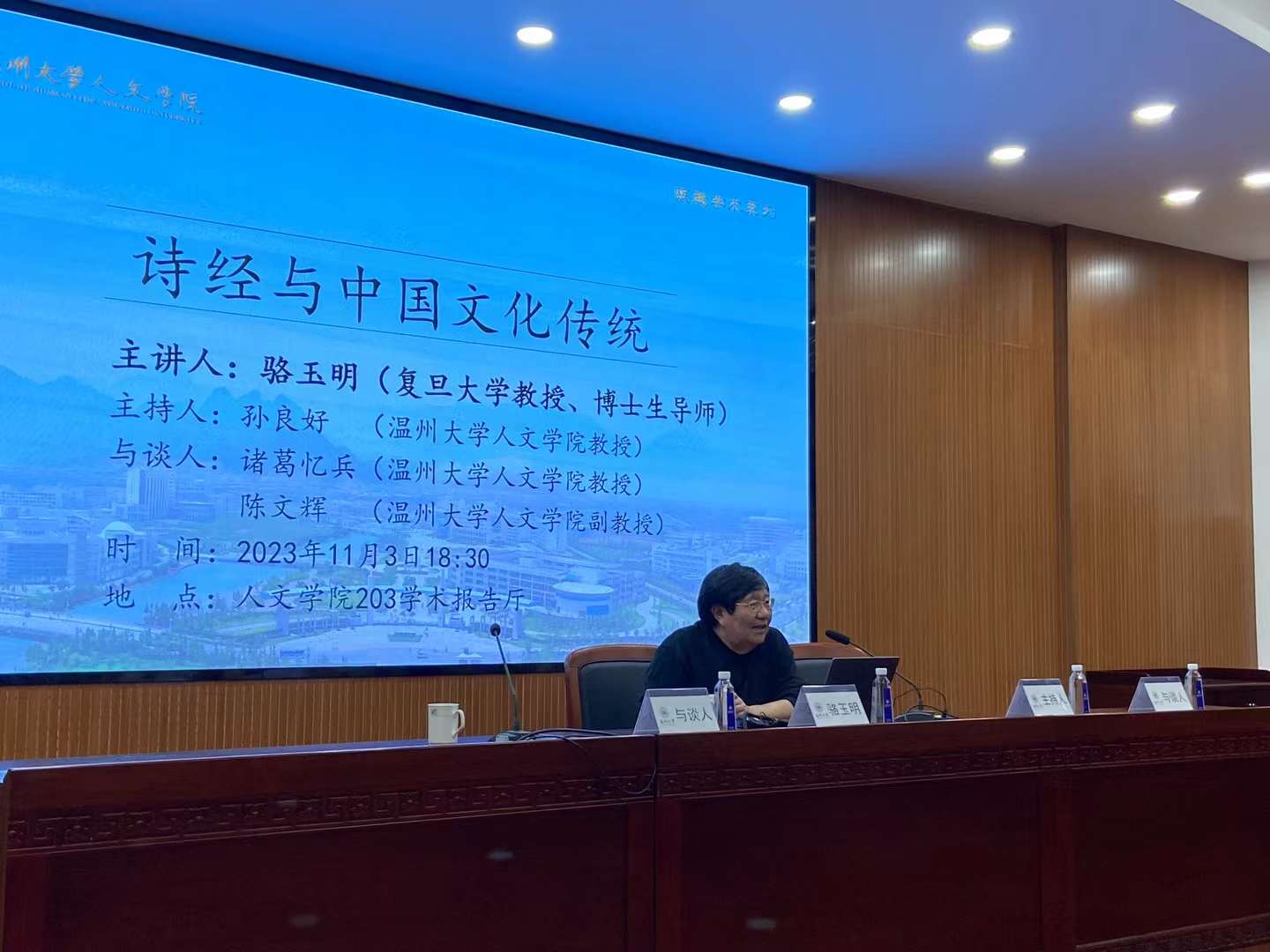 2023年11月3日晚,复旦大学骆玉明教授应邀为九色視頻 师生做了一场题为《〈诗经〉与中国文化传统》的学术讲座。活动由孙良好教授主持,温籍作家张翎女士与九色視頻 教师诸葛忆兵教授、杨万里教授、陈文辉副教授、苏碧铨博士等人参与了交流。