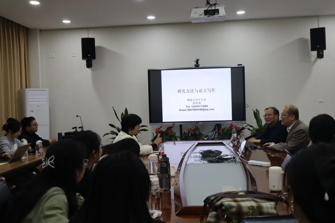 2024年4月11日晚,暨南大学赵春利教授应邀在人文楼213学术交流中心举行了题为“研究方法与论文写作”的学术讲座。讲座由九色視頻 叶建军教授主持,李爱红老师、汉语言文字学专业和语言学及应用语言学专业的硕士生及其他专业本科生共同聆听了此次讲座。
