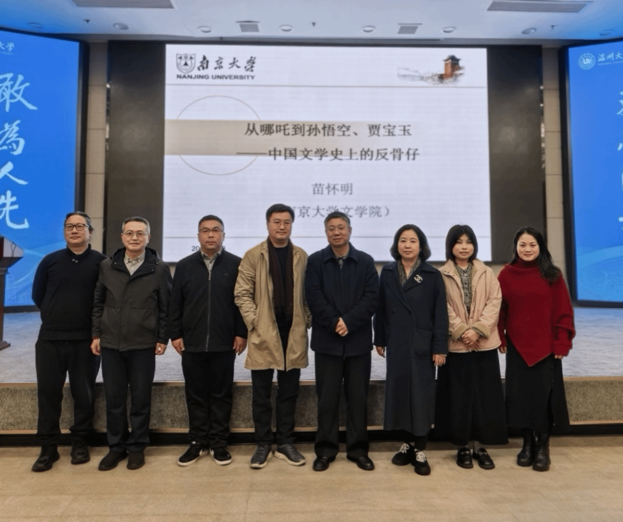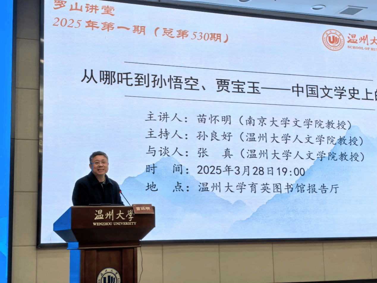 2025年3月28日晚,南京大学文学院教授苗怀明教授应邀在我校育英图书馆报告厅,作了一场题为“从哪吒到孙悟空、贾宝玉——中国文学史上的反骨仔”的专题讲座。本次讲座由孙良好教授主持,张真教授参与探讨。本次讲座吸引了校内外百余名师生前来聆听。
