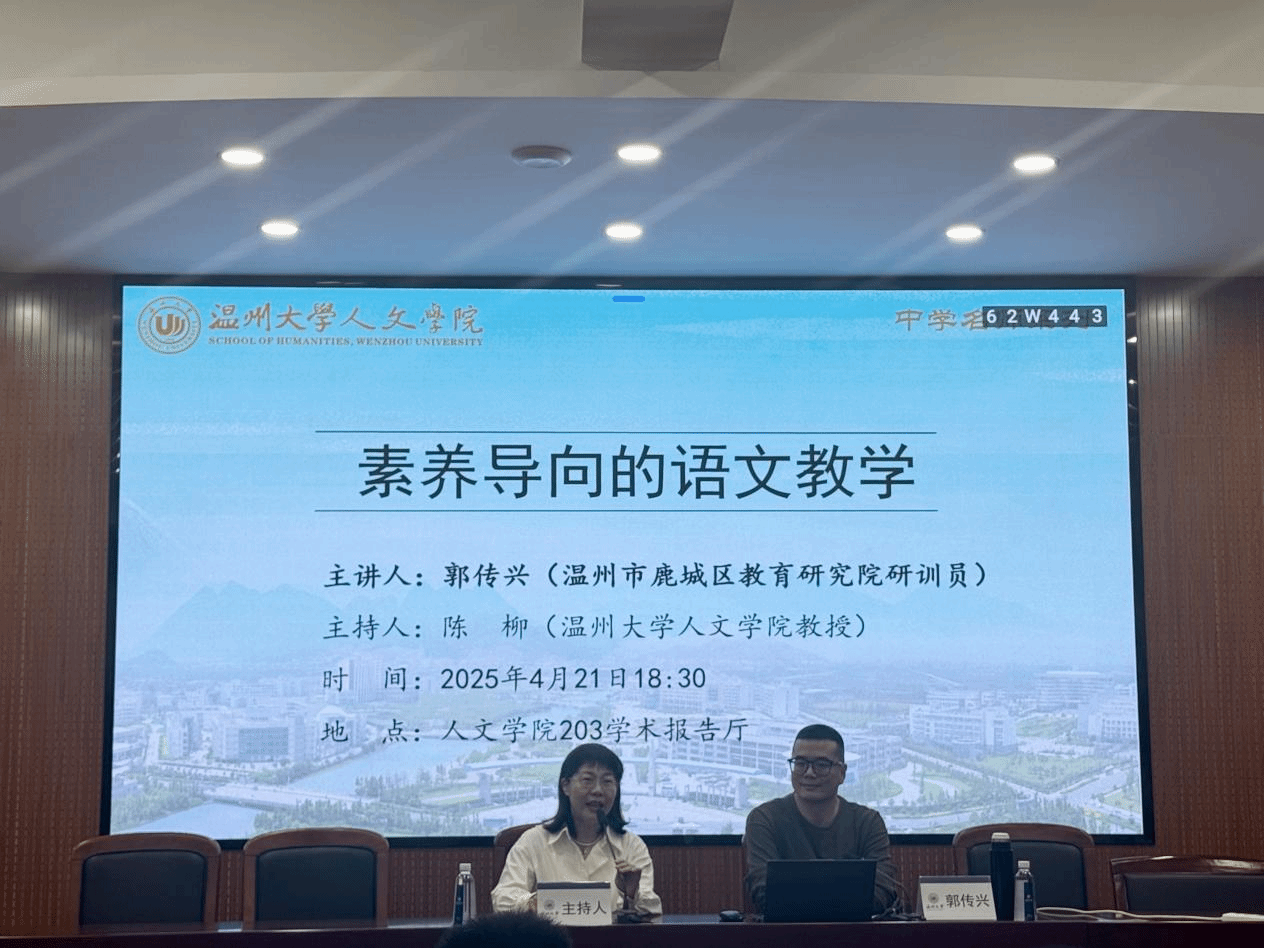 2025年4月21日晚,温州市鹿城区教育研究院初中语文研训员、正高级教师郭传兴老师来到我院主办的瓯越中学语文教学精品讲坛,主讲本次讲座,讲座的主题为“素养导向的语文教学”。