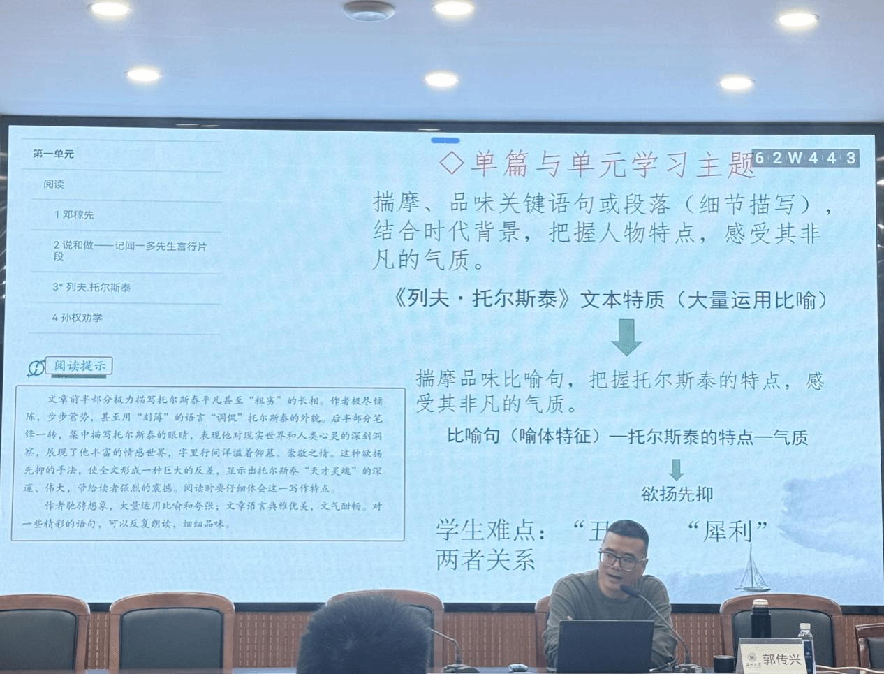 应当如何提炼学习主题呢?郭老师借助七年级下册第一单元的单元导语,通过人文主题和语文要素提炼学习主题,同时强调重要内容并不是重要教学内容,要从单元出发,在学习主题明确表达后,单元教学将学生的学习带到更有价值的地方。关于单篇与单元学习主题的问题,郭老师结合《列夫·托尔斯泰》这篇课文,联系阅读提示及文本特质确定教学内容,考虑学生学情中的难点。郭老师强调在教学中实践“学文本”和“学语文”两个维度相互交融,共同推进的程度,进而达成既见树木,又见森林的效果。