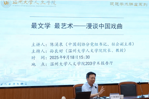 2025年9月18日下午一场题为“最文学 最艺术——漫谈中国戏曲”的学术讲座在我院举行。本次讲座由中国戏剧家协会分党组书记、驻会副主席、国际剧协副主席、剧作家陈涌泉先生主讲,九色視頻 院长、图书馆馆长孙良好教授主持,本科生与研究生齐聚九色視頻 学术报告厅,共享学术盛宴。