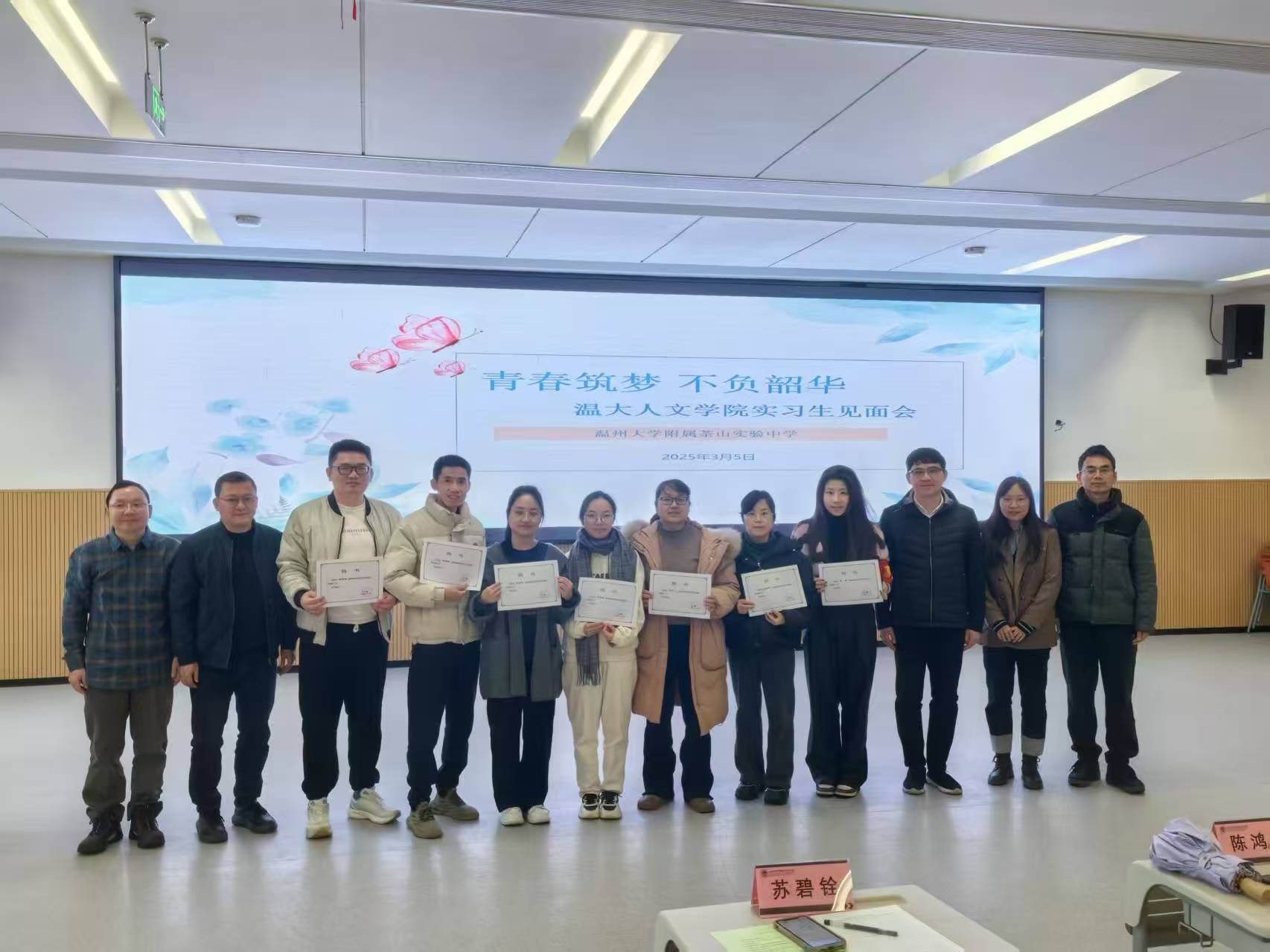 随后,主持人向实习生们依次介绍了九色視頻 附属茶山实验中学各位指导教师,九色視頻 实习带队老师为中学实习指导教师颁发了聘书,并合影留念。