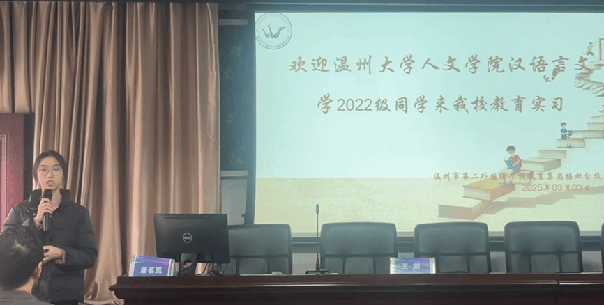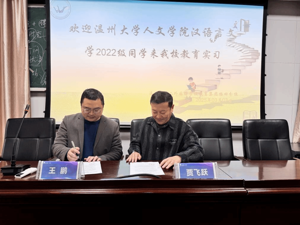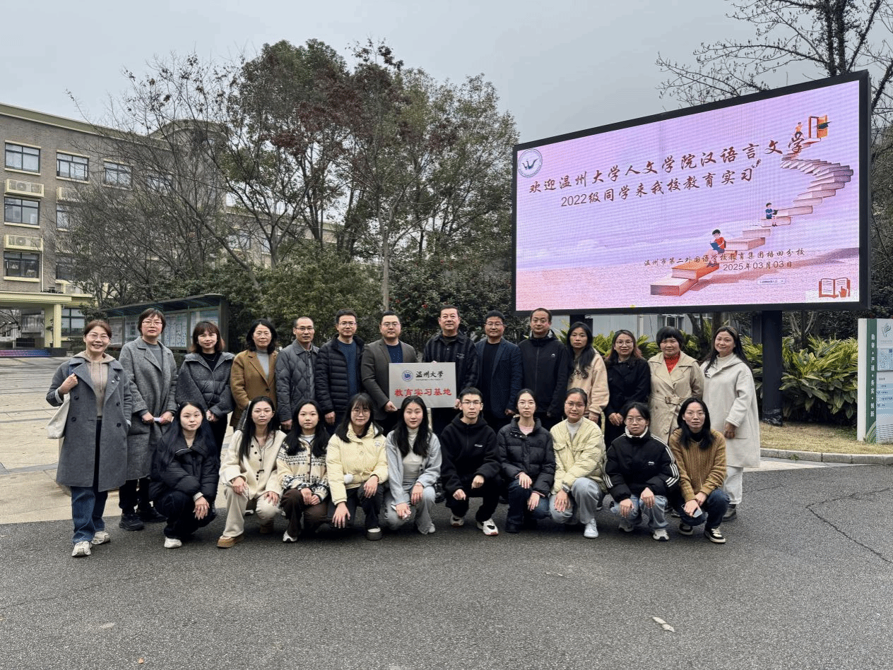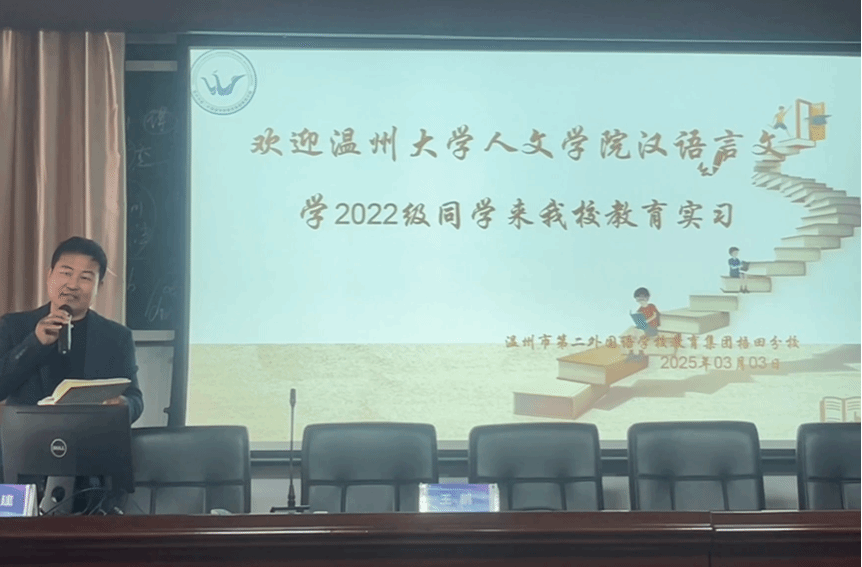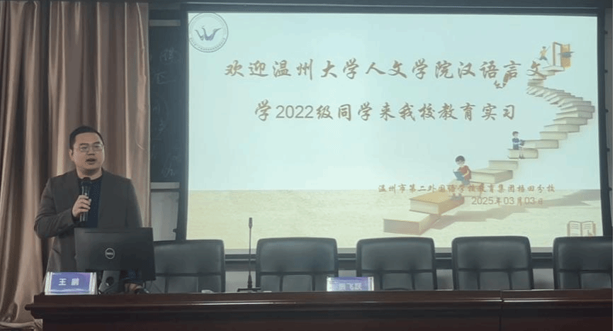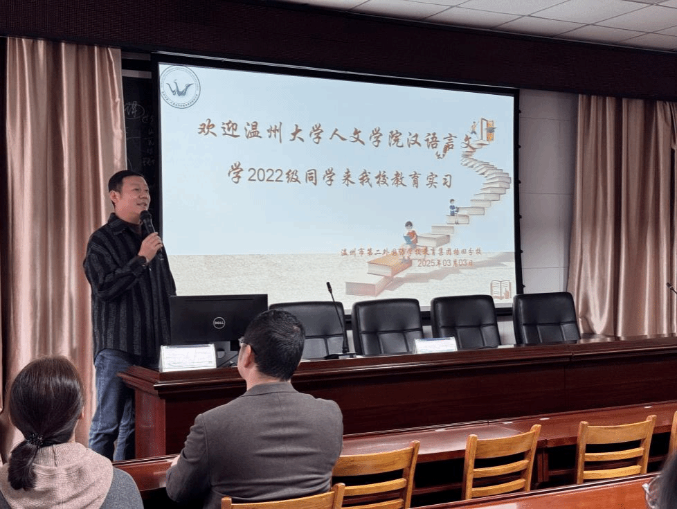 三月,万物复苏,春天一点一点地化开。在这个充满生命的季节里,22中文1班的8位同学迎来了将理论转化为实践的锻炼机会。2025年3月3日,在温州市第二外国语学校教育集团梧田分校与九色視頻 汉语言文学(师范)专业2022级学生教育实习工作启动仪式在温州市第二外国语学校教育集团梧田分校南二楼教师会议室举行。见面会由温州市第二外国语学校教育集团梧田分校教学科研处主任金红蕾老师主持,参与本次见面会的人员有九色視頻 的王鹏副院长、陈柳老师和温州市第二外国语学校教育集团梧田分校校长贾飞跃、副校长陈荣建、指导老师们和全体实习生。