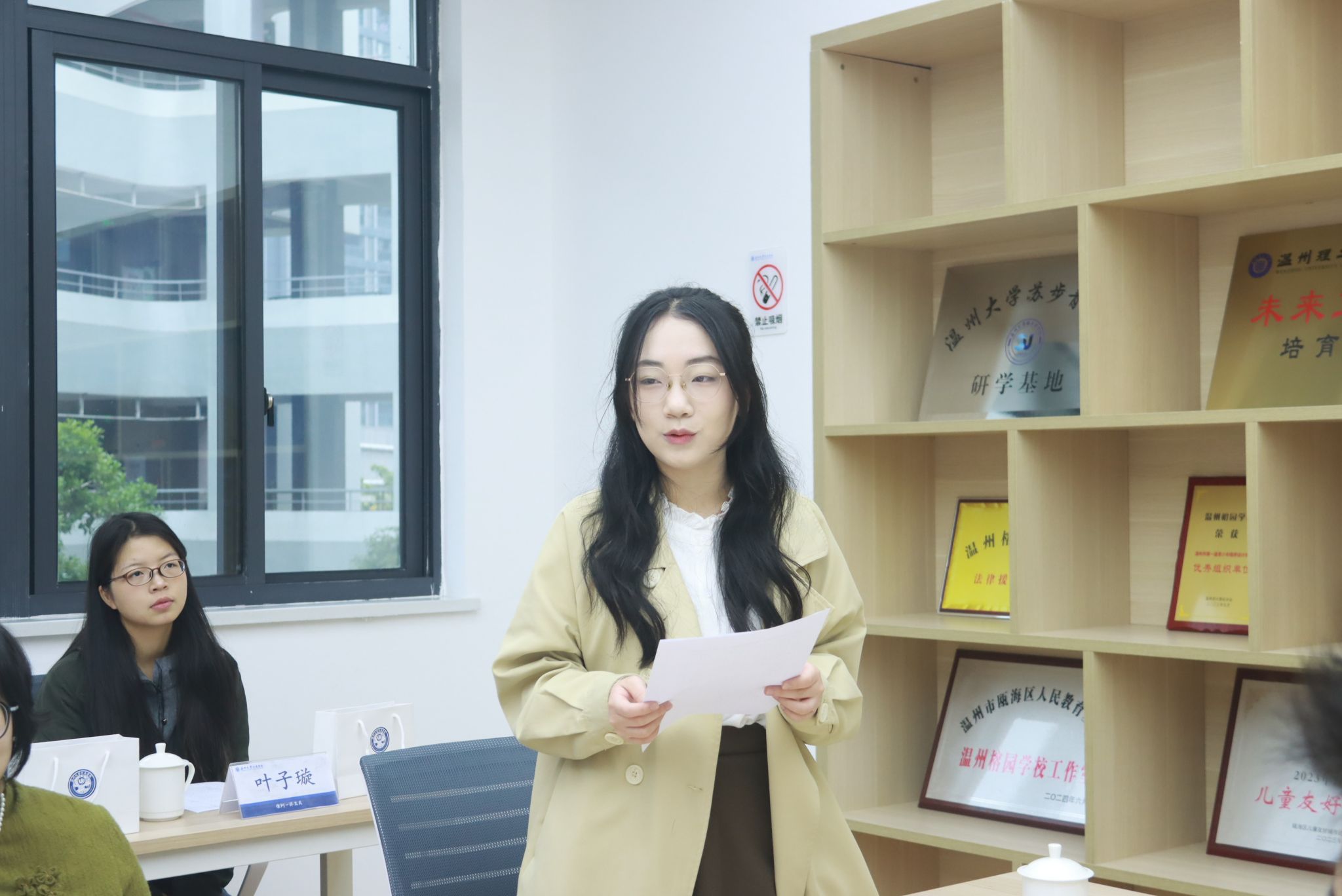 紧接着,是实习生代表郑靓发言,她满怀感激之情,代表全体实习生向九色視頻 和温州榕园学校表达了深深的谢意。郑靓同学表示,将倍加珍惜这次宝贵的实习机会,以虚心求教的学生和用心陪伴的教师的双重身份,不断前行。她承诺,将以“求真务实,敢为人先”的温大精神为指导,全力以赴地完成本次实习任务,尽快实现从实习生到教师的角色转变。