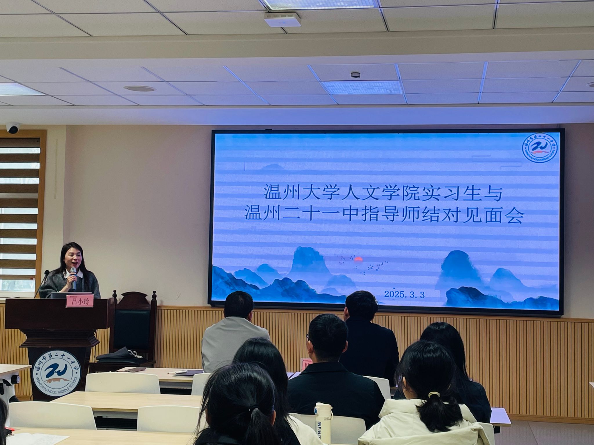 吕小玲副校长随后登台致辞,对温大师生的到来表示热烈欢迎,并详细介绍了学校概况。吕校长特别强调,本次实习聚焦初中语文教学,鼓励实习生珍惜机会,做到课前想问题,课中多观察,课后勤思考;同时要抓住机会,多向语文组名师学习,积极参与教改实践;更要创造机会,转换角色,尝试向学生学习,为未来教师生涯奠定坚实基础。