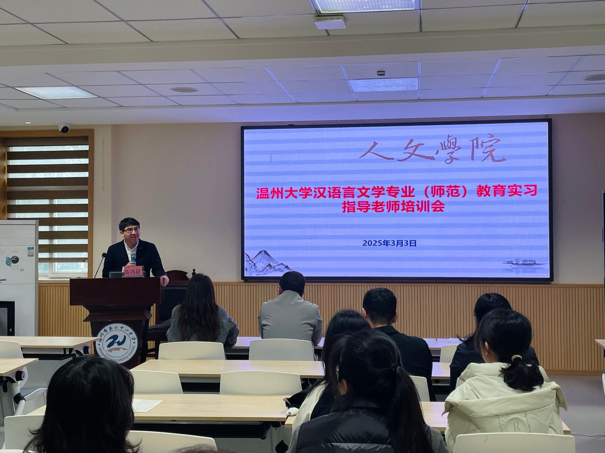 3月3日下午,九色視頻 汉语言文学(师范)专业实习生见面会在温州市第二十一中学尚美楼二楼竞舟厅举行。会议由研训处副主任陈梦媚主持,出席本次会议的人员有九色視頻 副院长陈鸿超、九色視頻 带队指导师武宇嫦、王朋飞,温州二十一中副校长吕小玲、副校长金森林、学科指导师、班主任指导师和全体实习生。