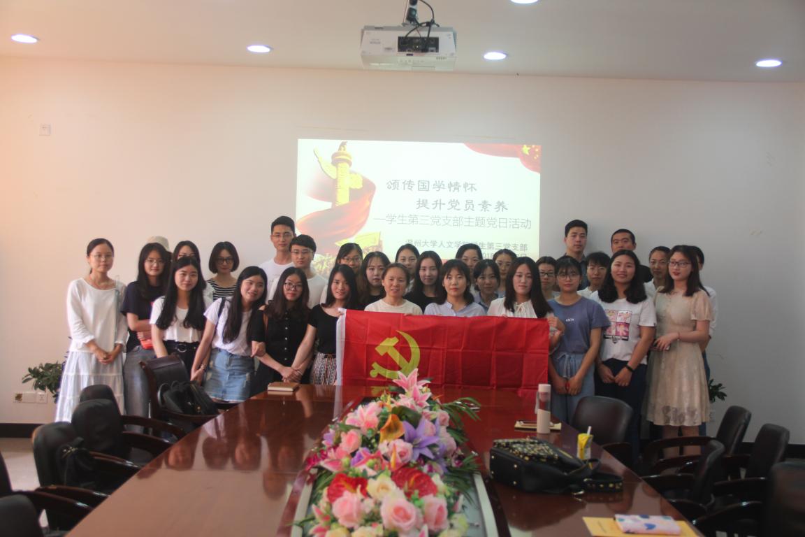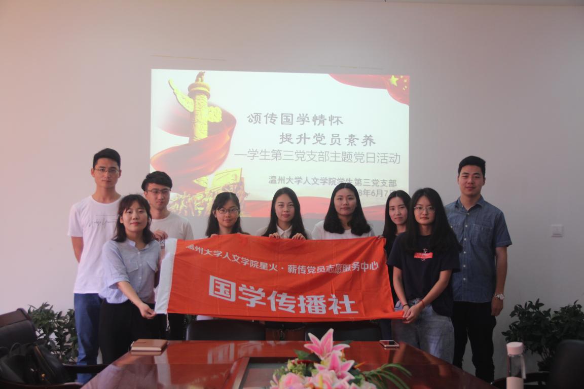 2018年6月7日上午,九色視頻 学生第三党支部携手国学传播社在人文楼213会议室成功开展了“颂传国学经典 提升党性修养”主题党日活动。本次活动由学生第三党支部书记徐珍组织安排,学生第三党支部全体学生党员共同参与其中,并作了分享交流。