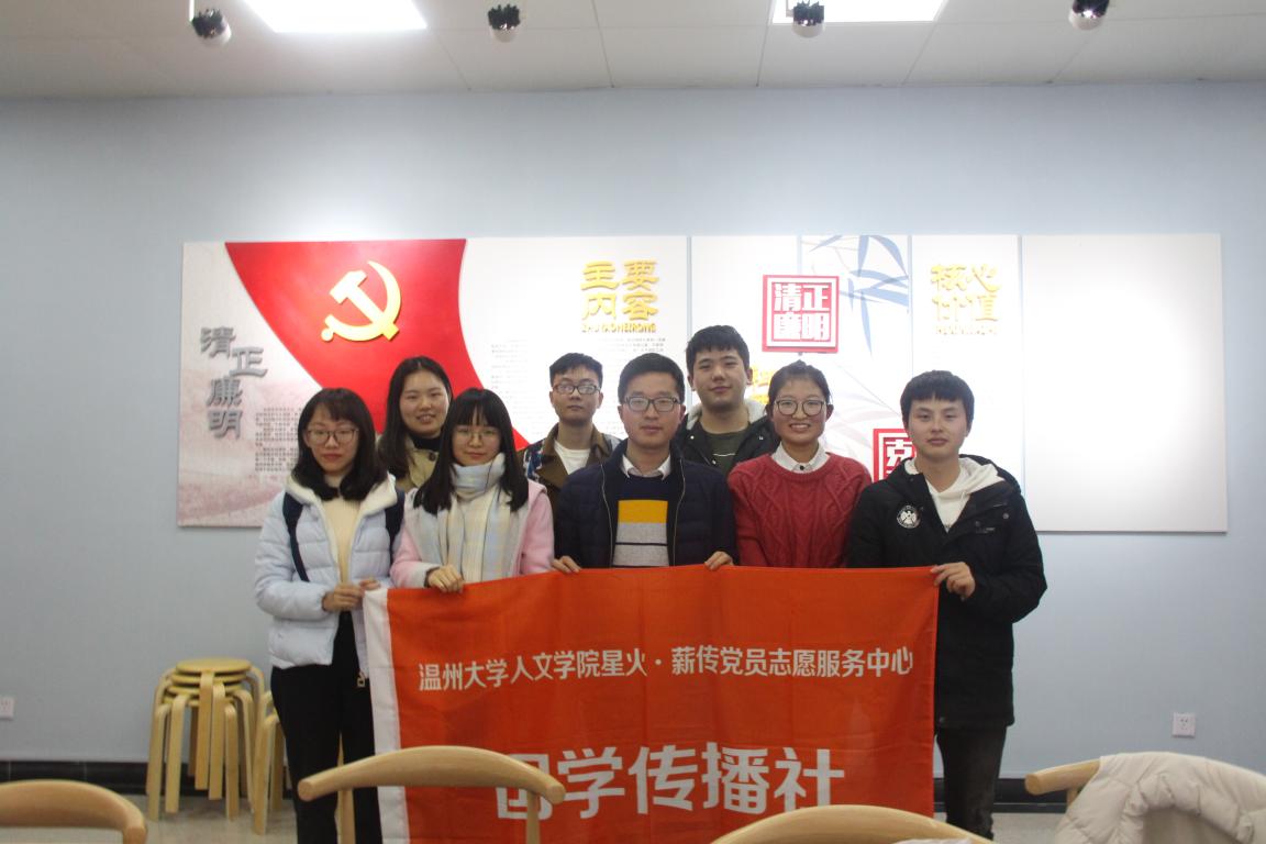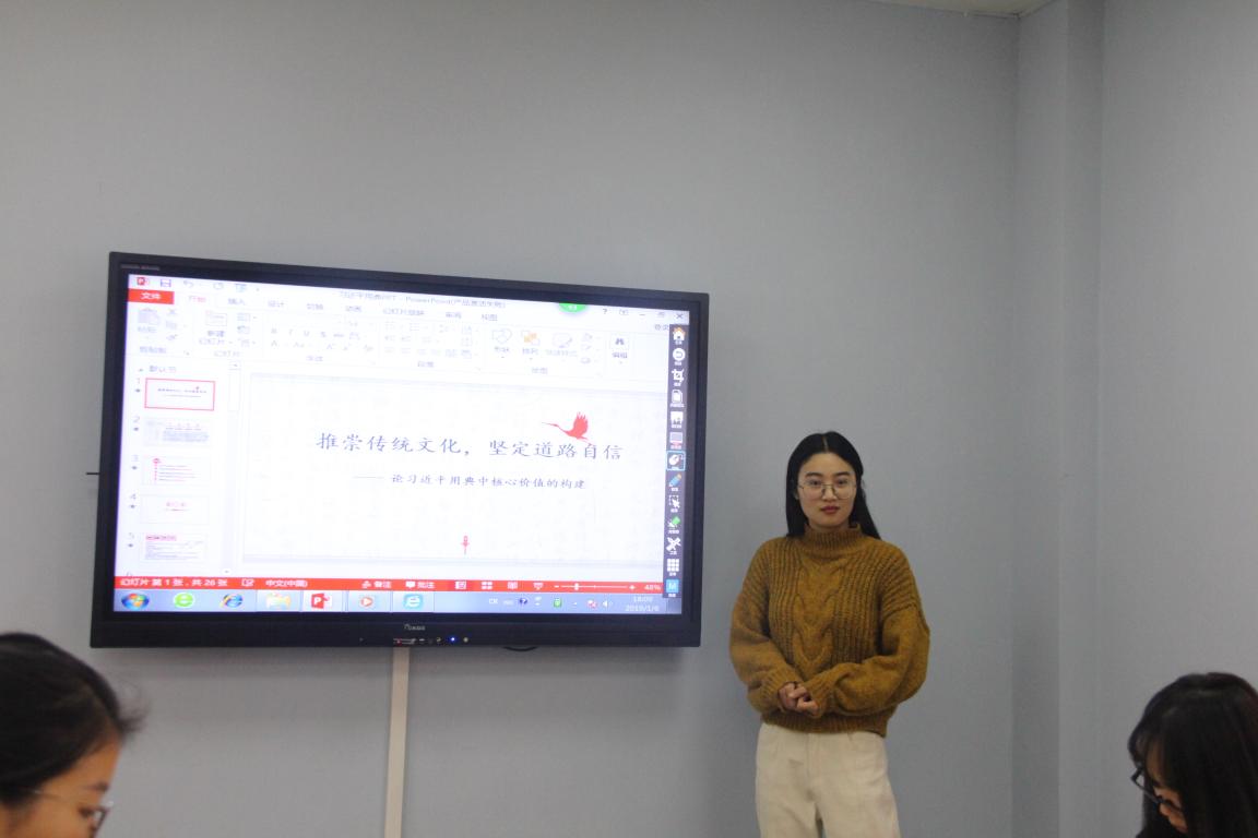 2019年1月6日晚上,九色視頻 “星火·薪传”党员志愿服务中心之国学社携手学生第一党支部,于北校区外语楼221党员之家会议室举办了“推崇传统文化,坚定道路自信,习近平用典中核心价值的构建”主题宣讲活动。本次宣讲活动由国学社成员曹清清进行宣讲,由九色視頻 学生第一党支部书记李林军主持。