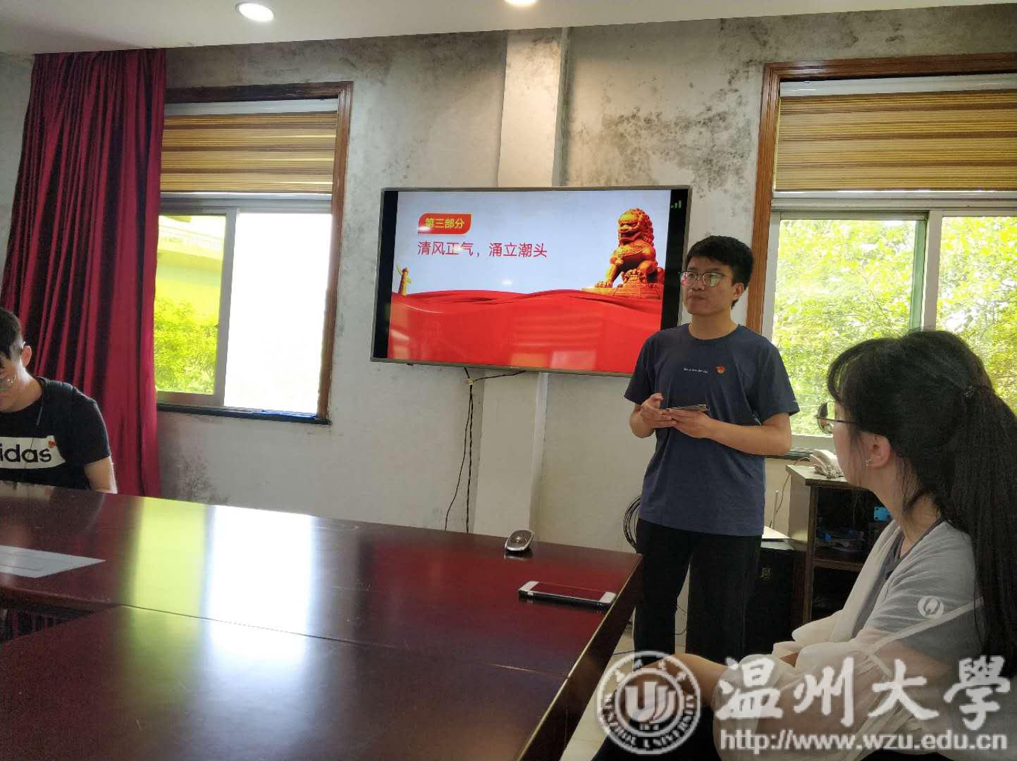 活动第三项是王泽同志进行了“廉洁自律,永保初心——警示教育专题组织生活会”的主题宣讲。宣讲共分为三个部分,第一部分是“以案说纪,以律归心”,以近年来违反党纪的官员和发表错误言论的党员为例,列举了周永康、武长顺、洁洁良等事件,引出《中国共产党纪律处分条例》。第二部分为“加强自身廉洁教育”,向我们阐释了“廉洁”的具体含义,以及身为大学生我们所需要做到的廉洁。第三部分为“清风正气,涌立潮头”,在新的时代,以全新的社会风貌,以高效的廉洁建设来加强制度建设。这场宣讲活动警示了同志们要时刻保持廉洁,加强廉洁教育。