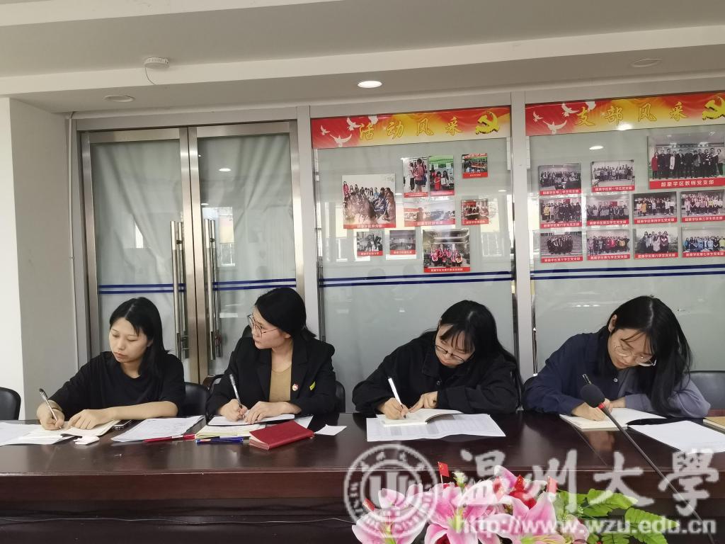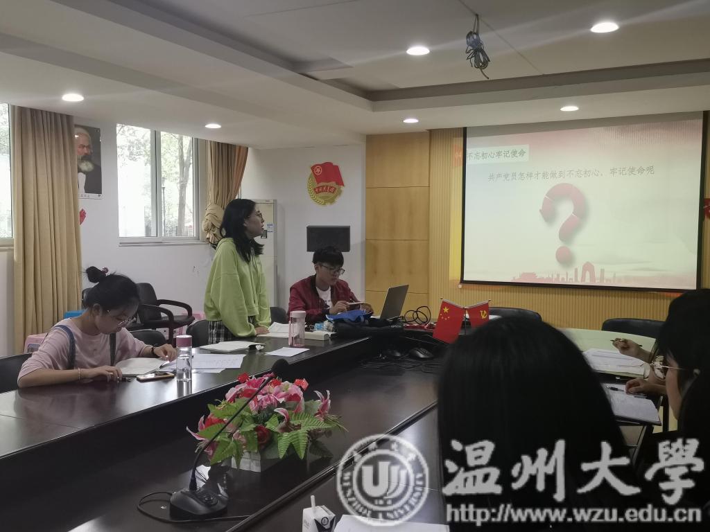 2019年10月20日中午,九色視頻 学生第四党支部的数十位党员于超豪学区四号楼党员之家举行了“守初心、担使命”主题教育活动。本次主题教育活动以党课的形式开展。