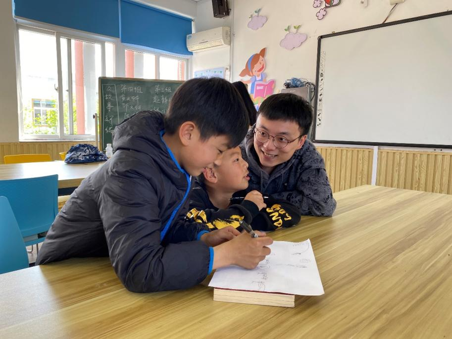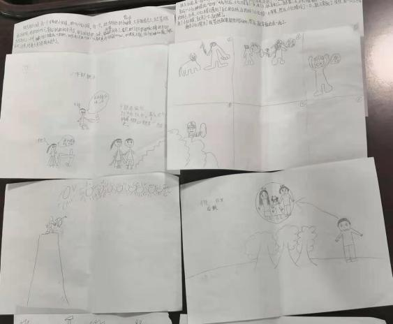 草长莺飞四月天,三角梅阵阵飘香,正如孩子们天真烂漫的笑脸。这一回,党员志愿者们准备的第一项活动就是带着孩子们一同谱写故事的新乐章。为了让故事新编游戏进行得更加顺利,党员志愿者们耐心细致地启发孩子们开动小脑筋,一个个奇思妙想的故事从孩子们的口中蹦出。教室里,12个孩子三三两两地自愿成组,每组配备两位志愿者共同完成故事新编。一边竭尽全力苦思冥想,一边欢声笑语不断,创新思考脑洞大开的过程轻松且愉悦。创作的火花不断闪现,在三四年级小朋友们的小脑瓜里有盘古开天辟地的“褐色墨水”与女娲造人的混合进阶版;也有小红帽和红太狼与白雪公主的后妈毒苹果以及遇到白马王子的联动;还有也有十分贴切现实生活的一面,大灰狼是被巨额的红包索取而致破产露出马脚。后羿射日与牛郎织女的故事也得到了漫画形式的再演绎。孩子们克服恐惧,走上台前,大胆地讲述自己的故事,欢笑声与鼓掌声在教室上空阵阵回荡。