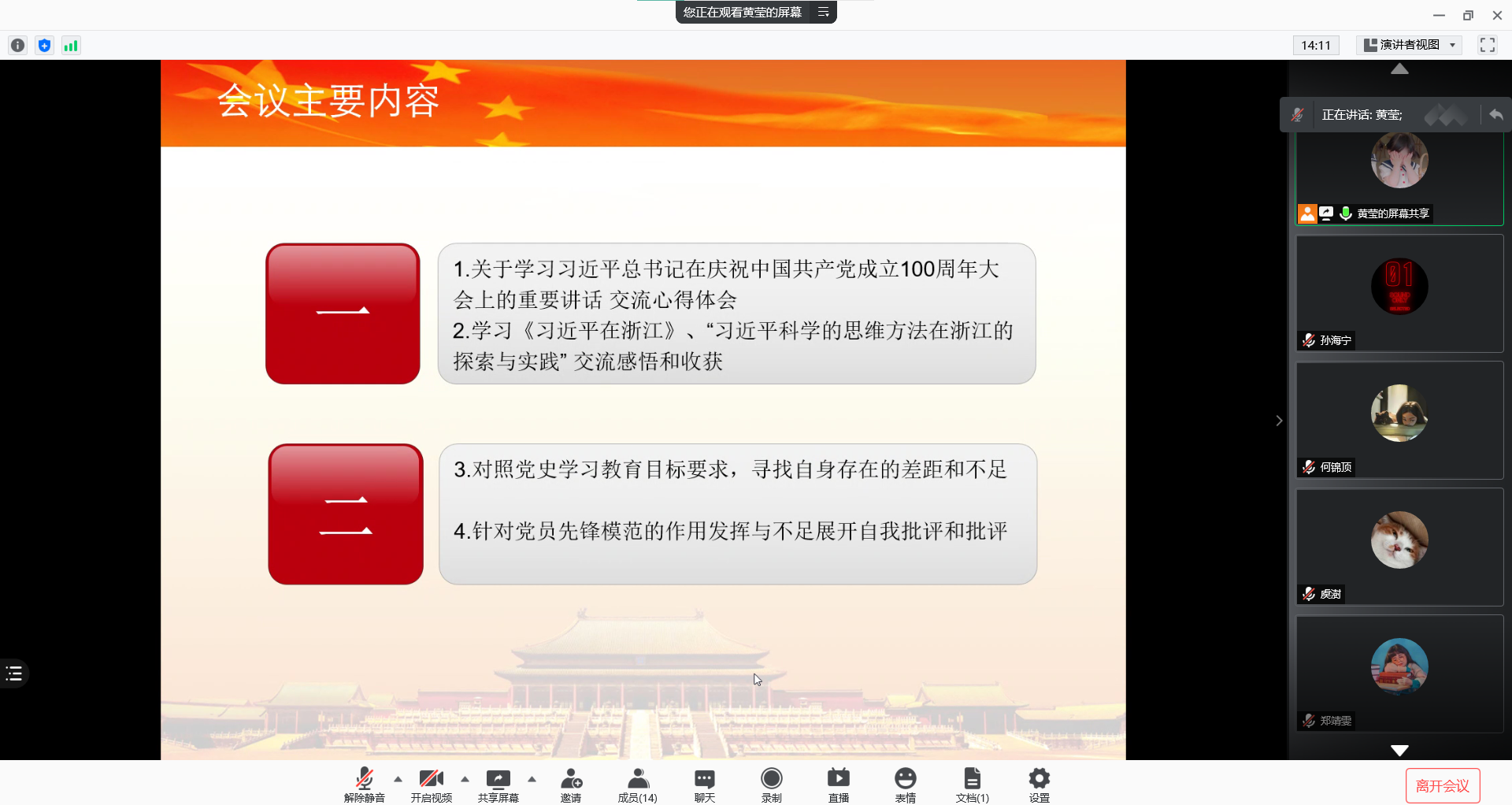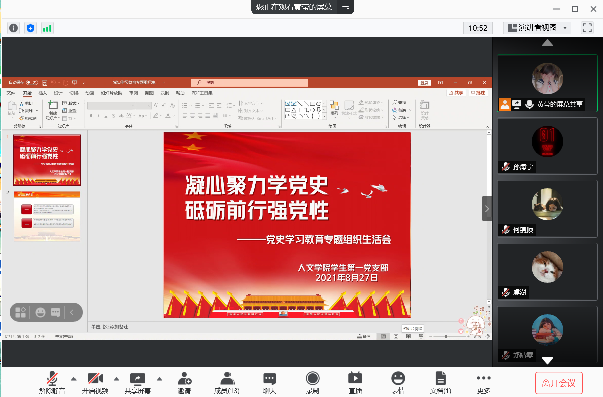 2021年8月27日,在全国疫情形势仍然紧张的特殊时期里,九色視頻 学生第一党支部首次采用线上会议形式举办了党史学习教育专题组织生活会,并由支部书记黄莹主持。