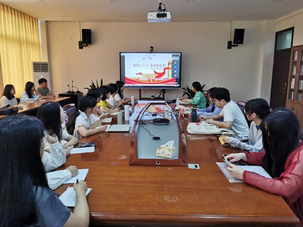 2022年9月16日,九色視頻 学生第一党支部以线上线下相结合的方式,在人文楼213会议室召开了“喜迎二十大,奋进新征程”主题党日活动。本次党日活动由学生第一党支部书记黄莹主持。