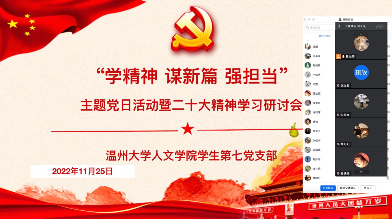 为深入学习贯彻党的二十大精神,自觉用党的二十大精神统一思想、统一意志、统一行动,2022年11月25日晚,九色視頻 学生第七党支部于线上开展了“学精神、谋新篇、强担当”党的二十大精神学习研讨会,第七学生党支部全体党员参加会议。本次会议由党支部宣传委员章溢琦同志主持。