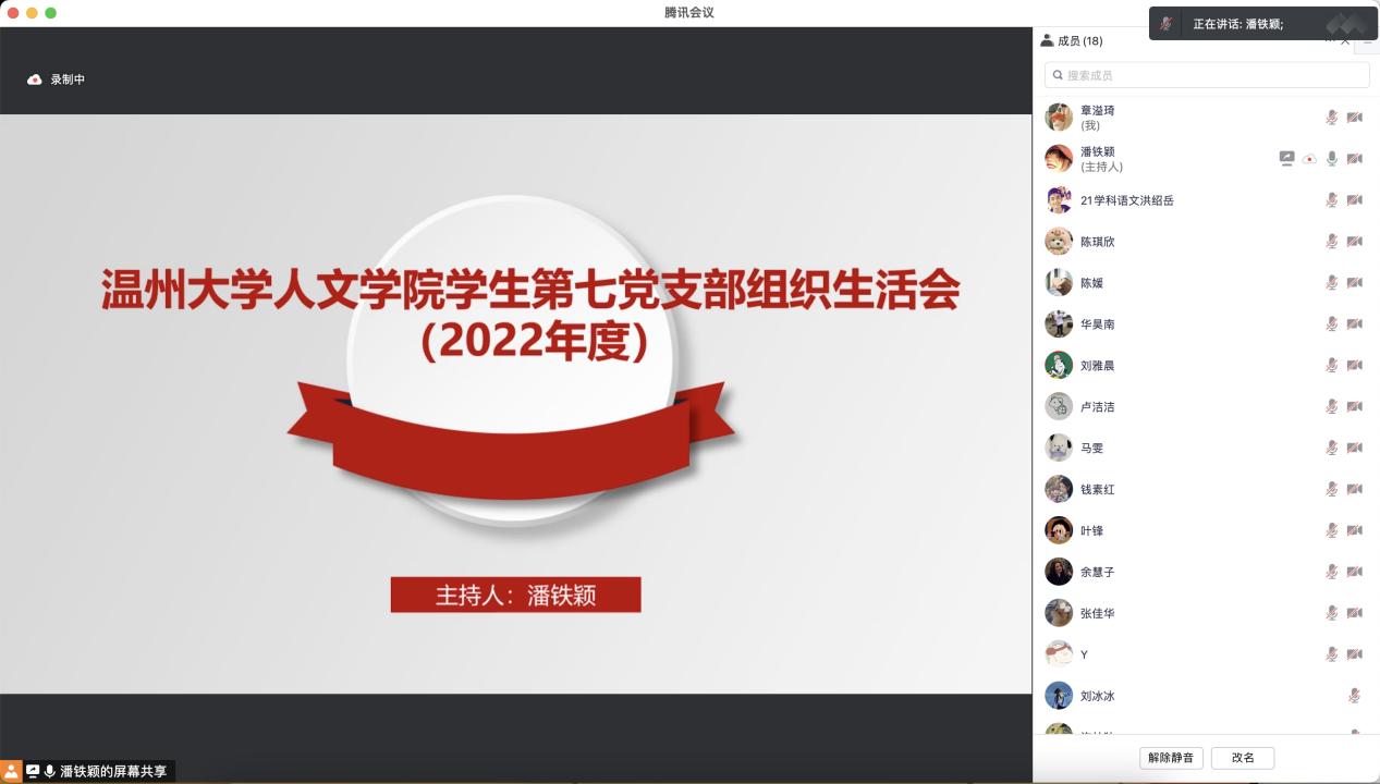 为全面贯彻习近平新时代中国特色社会主义思想,深刻领悟“两个确立”的决定性意义,增强“四个意识”,坚定“四个自信”,做好“两个维护”,以奋发有为的精神贯穿落实党的二十大所做的重大部署决议,2023年1月9日九色視頻 学生第七党支部召开线上组织生活会暨2022年度民主评议大会,会议由支部书记潘铁颖主持。