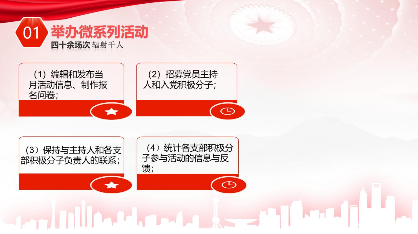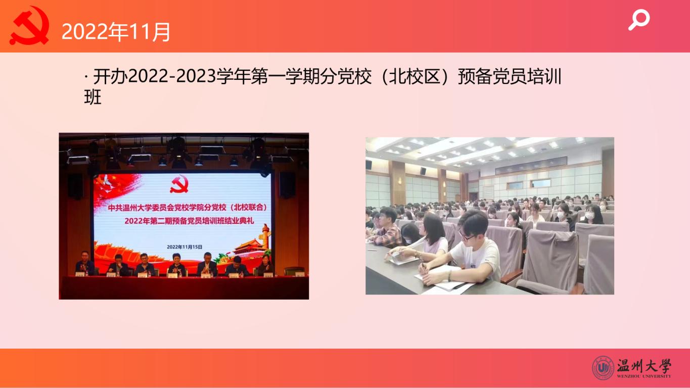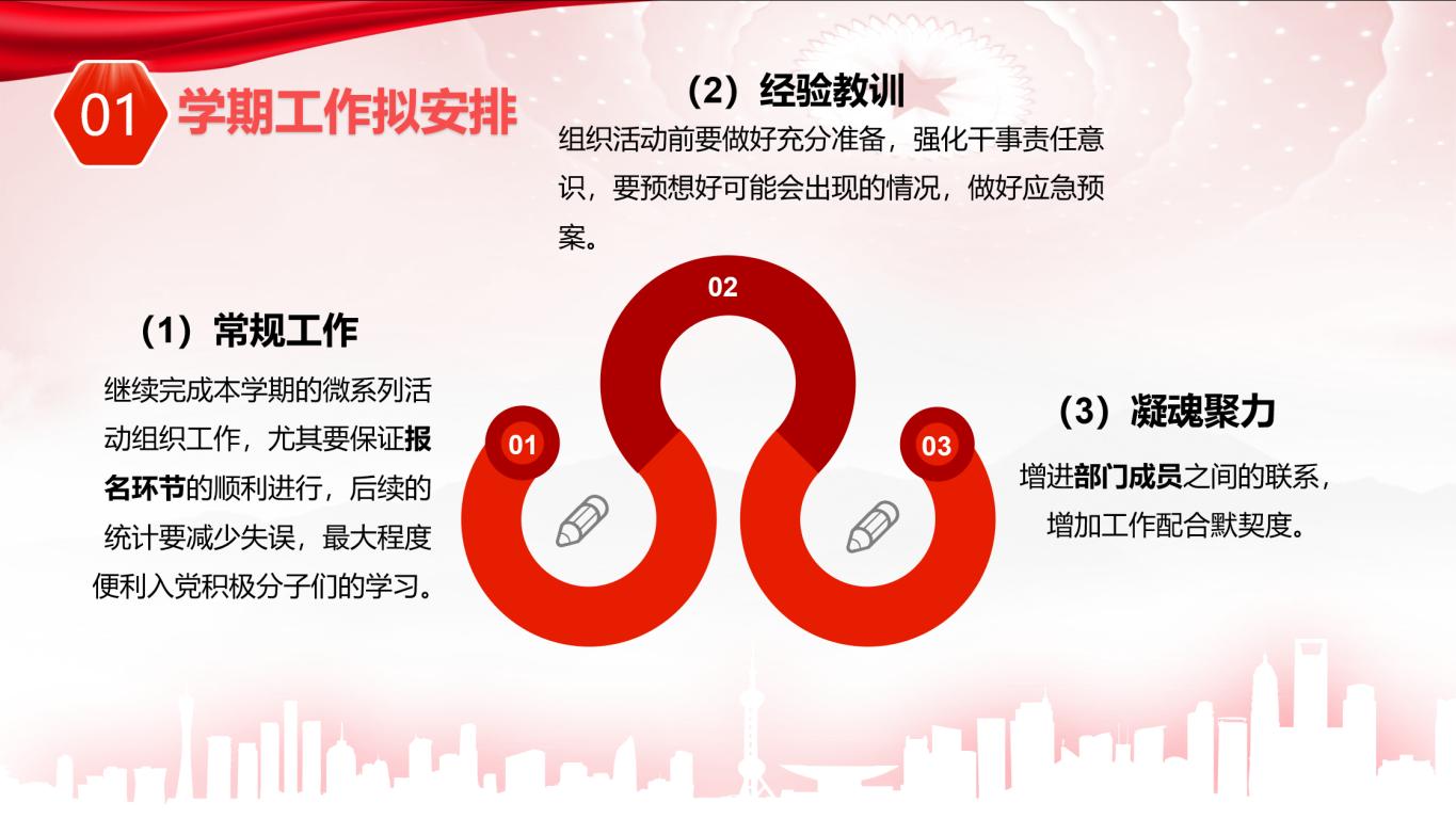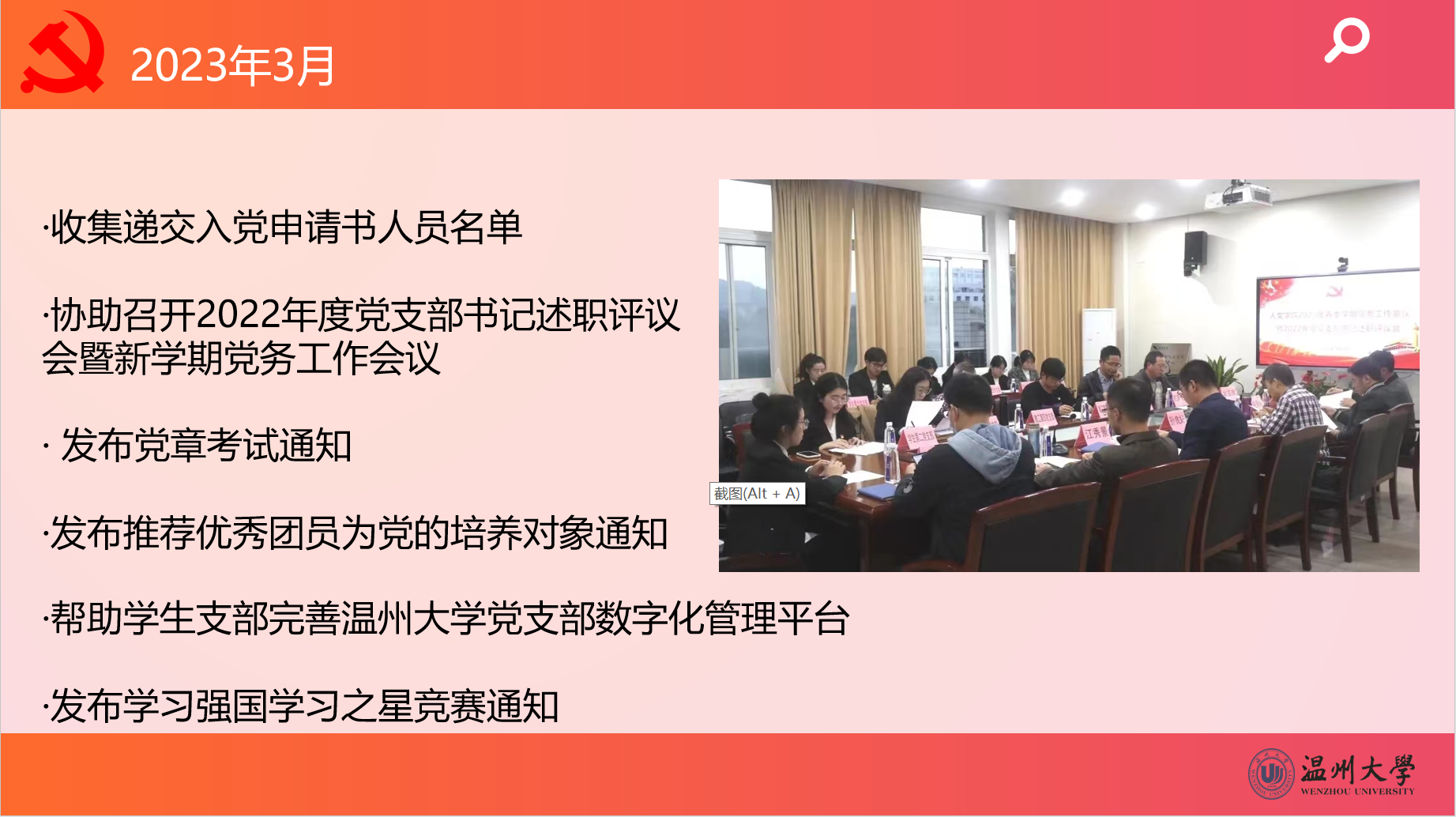 发展部部长徐林镭从两个方面进行工作总结。首先是2022-2023学年第一学期的工作概况,徐林镭按照时间顺序梳理了党组织关系转接、收集党章考试名单、召开党服内部推优大会、年终党建数据统计等相关工作;其次是2022-2023学年第二学期的工作规划,徐林镭将每个月的工作罗列,为接下来更好地开展工作指明了方向。