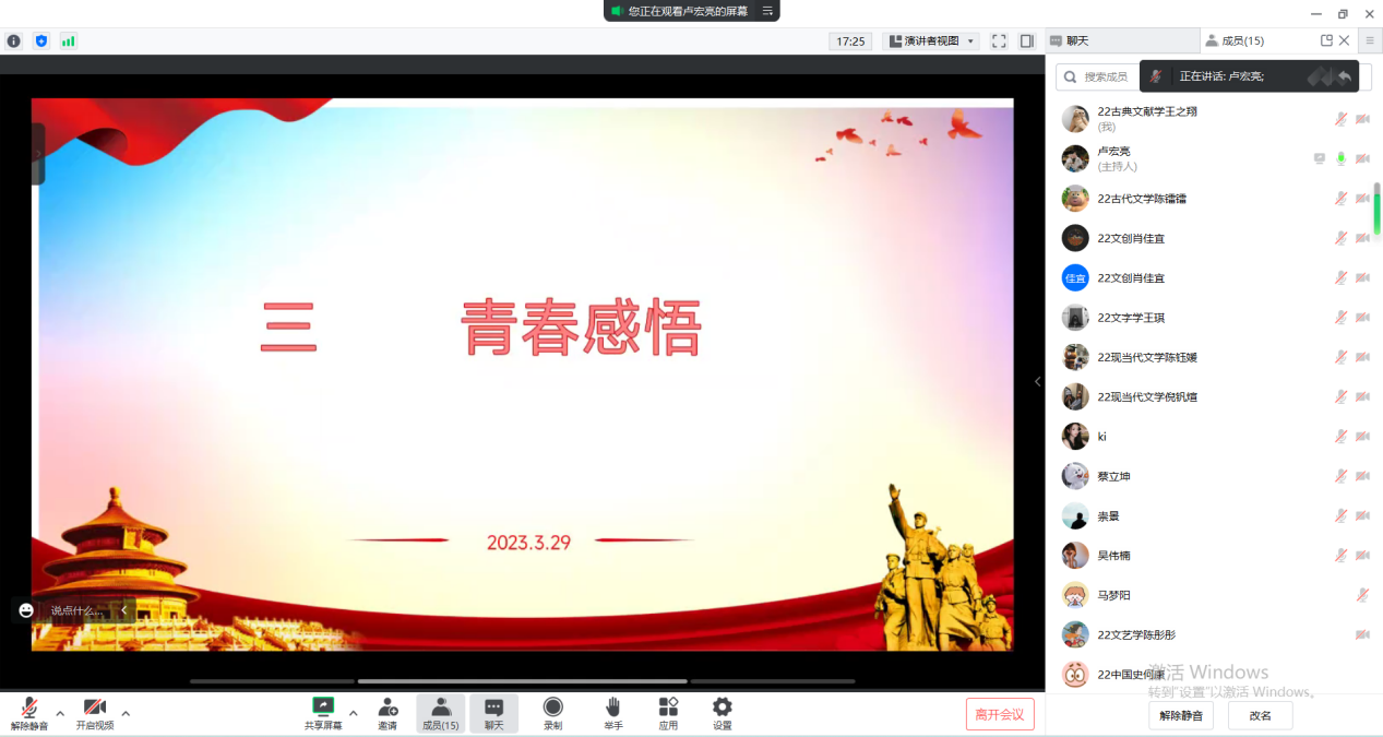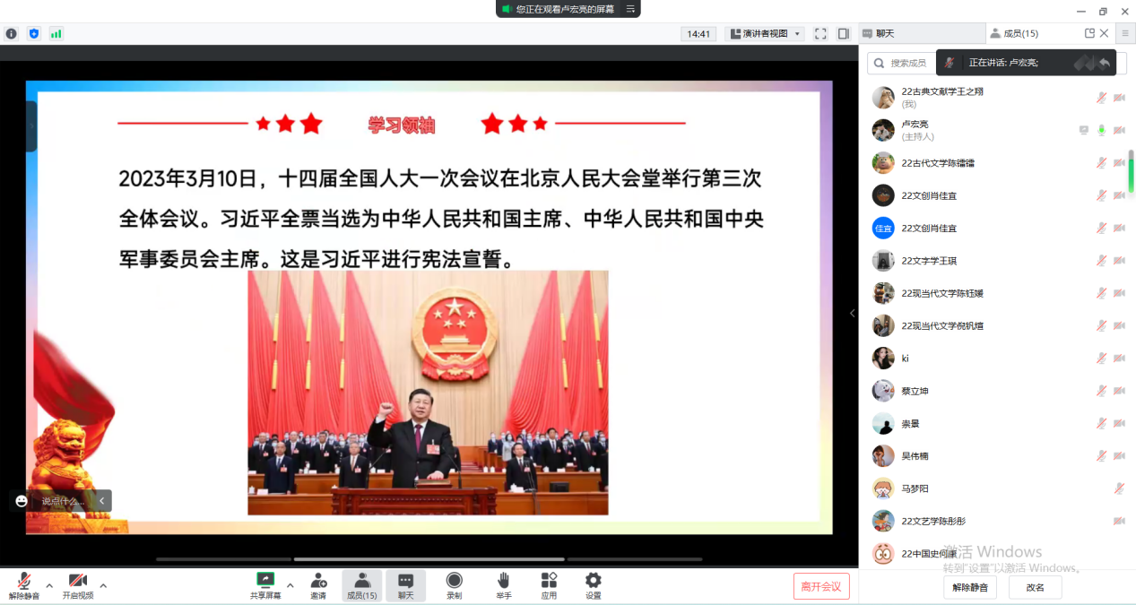 2023年3月9日16点,九色視頻 学生第三党支部于线上召开“学党章、强党性、作表率”主题党日活动。本次党日活动由支部宣传委员卢宏亮主持,共有16位党员参加。活动共分为以下三项内容。