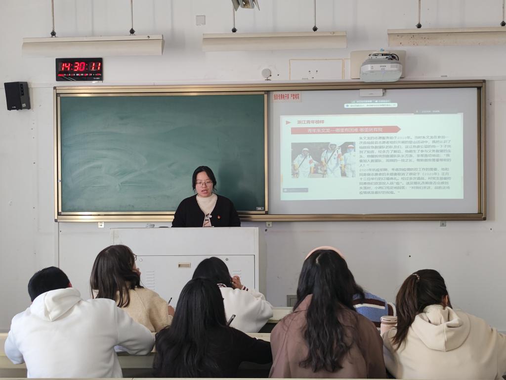 随后,各位党员同志一起学习了浙江优秀青年朱文龙、李亚飞的事迹。朱文龙作为2022年浙江省最美志愿者,参加过应急救援保障、抗洪抢险等行动五十多次,救助被困群众七十余人。李亚飞作为浙江省“十佳大学生”,始终将自己未来的发展融入整个社会的发展中去,更好地服务人民、服务大众。朱文龙身上“哪里有困难,哪里就有我”的初心与李亚飞身上“绿我涓滴,汇它千顷澄碧”的精神激励着每位同志为全面建设社会主义现代化国家贡献青春力量。