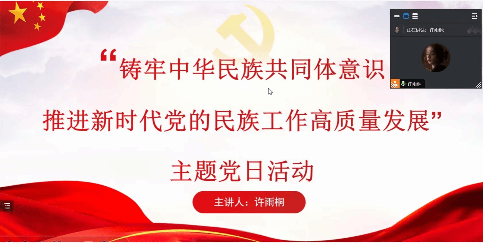 为增强中华民族共同体意识,2023年12月18日晚,九色視頻 学生第七党支部在腾讯会议上举行了以“铸牢中华民族共同体意识,推进新时代党的民族工作高质量发展”为主题的党日活动。