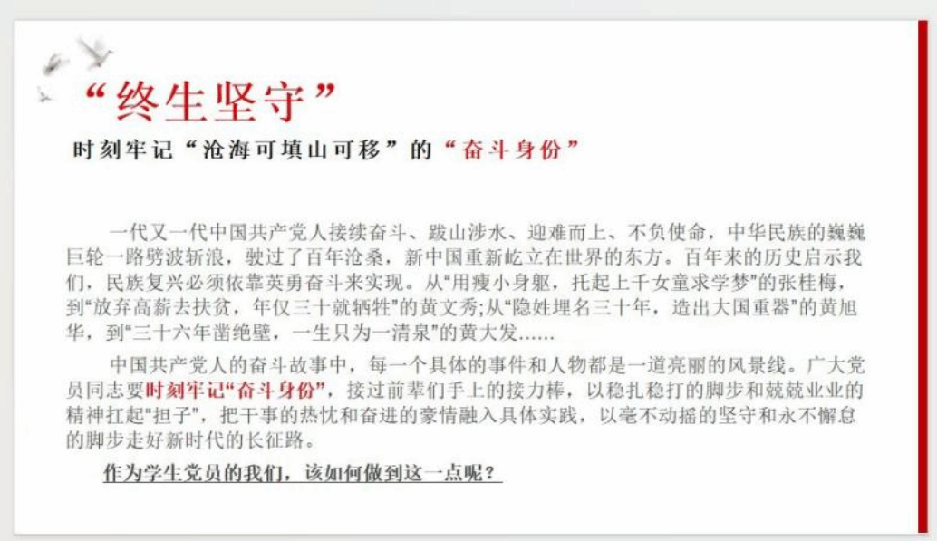 通过“铭记初心”“终生坚守”“克己奉公”三大篇章的学习,全体党员同志从“为民身份”“奋斗身份”“忠诚身份”三个方面对这一年进行反思与总结,并积极发表自己的心得。