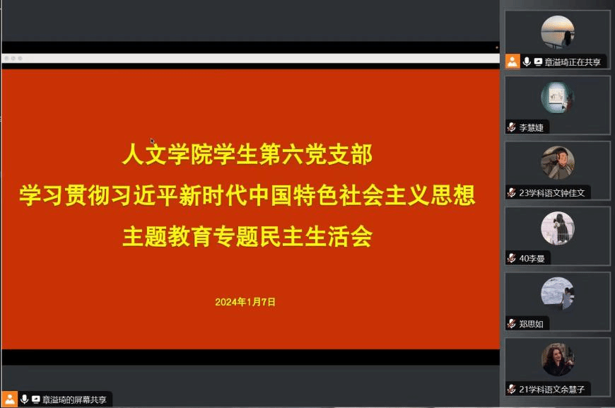 为进一步巩固主题教育学习成果,加强党支部作风建设,九色視頻 学生第六党支部于2024年1月7日召开学习贯彻习近平新时代中国特色社会主义思想主题教育专题民主生活会和党支部专题组织生活会暨民主评议党员工作会议。本次会议由第六党支部书记章溢琦同志主持。