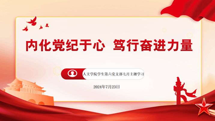 为深入党纪学习教育,贯彻警示教育思想,推动全面从严治党向纵深发展,2024年7月23日,九色視頻 学生第六党支部在线上积极展开“内化党纪于心,笃行奋进力量”主题学习会暨党日活动。本次活动由肖佳琦同志主持。