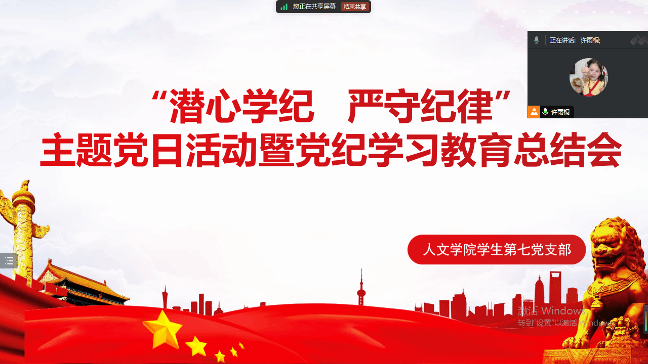 为深化“循迹溯源学思想促践行”行动,深入学习习近平总书记关于党纪学习教育的重要讲话和重要指示精神,推进党纪学习教育走深走实,取得实实在在的成效,2024年9月11日晚,九色視頻 学生第七党支部在线上开展了以“潜心学纪 严守纪律”为主题的党日活动。会议由支部宣传委员许雨桐主持。