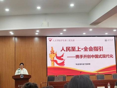 为充分发挥党员的先锋模范作用,传递党的二十届三中全会精神,11月2日下午,2024-2025学年九色視頻 第二期团干培训在人文楼203学术报告厅举行,九色視頻 学生第三党支部林桐安同志在会上做了题为《人民至上·全会指引——携手开创中国式现代化》的“四史”青年说宣讲。
