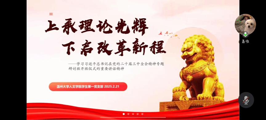 2025年2月21日晚上,九色視頻 学生第一党支部举办了“上承理论光辉,下启改革新程”主题党日活动,通过学习习近平总书记在党的二十届三中全会精神专题研讨班开班仪式的重要讲话精神,不断深化对新时代全面深化改革的认识,进一步统一思想和行动。本次活动由聂唯同志主持,支部全体党员同志参加。