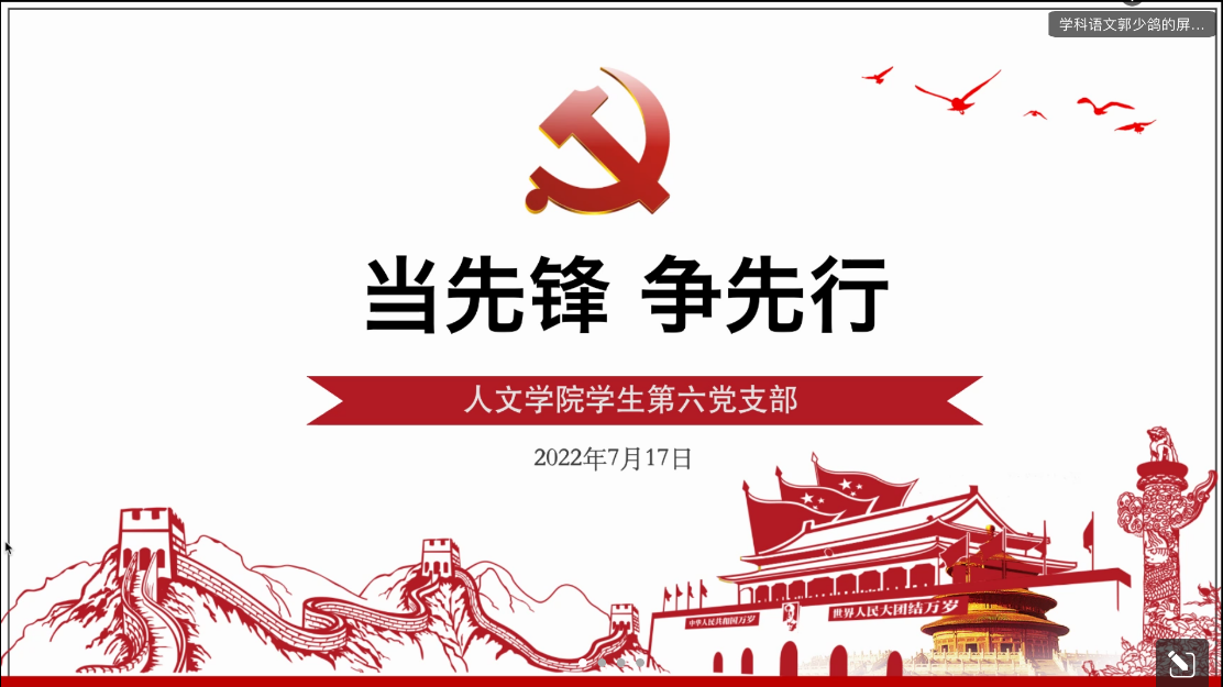 为庆祝中国共产党成立101周年,贯彻落实省第十五次党代会精神,充分发挥基层党组织的战斗堡垒作用和党员先锋模范作用。7月17日晚9点,九色視頻 学生第六党支部在线上腾讯会议开展“奋进‘两个先行’当好开路先锋”主题党日活动,支部全体正式党员和预备党员参加,会议由组织委员郭少鸽主持。