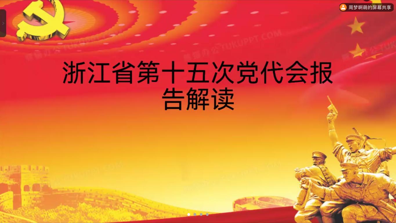 会议伊始,支部书记周梦淏带领支部全体同志学习浙江省第十五次党代会精神,以六个“新”出发,对浙江的新使命、新跨越、新征程上的伟大思想指引、新目标、新任务、党的建设新要求为切入点,对此次党代会精神做了详细解读,并希望各位同志以实际行动迎接党的二十大胜利召开,为实现第二个百年奋斗目标、实现中华民族伟大复兴中国梦做出新的更大贡献。