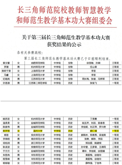 2022年5月17日,第三届长三角师范生教学基本功大赛结果公示,我校选手再创佳绩,18历本陈梦雅同学荣获中学历史组一等奖。
