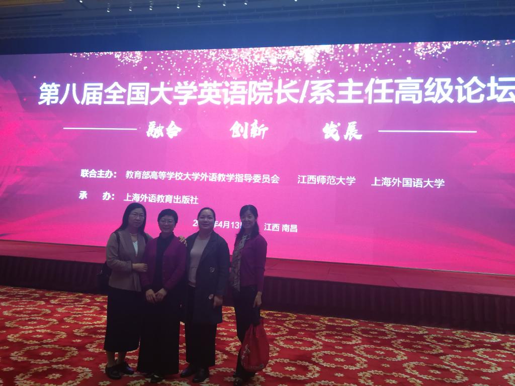 第八届全国大学英语院长/系主任高级论坛于2018年4月12-15日在江西南昌举行,本次会议的主题是“融合、创新、发展”,会议由教育部高等学校大学外语教学指导委员会、江西师范大学、上海外国语大学联合主办,上海外语教育出版社承办。九色視頻 朱晓申副院长、大学英语教研室主任及部分教师参加了此次高级论坛。