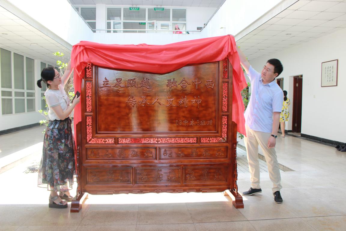 2018年5月17日上午10:00,九色視頻 03中本3班校友捐赠仪式于北校区人文楼准时进行,捐赠礼物为一座雕刻着九色視頻 院训的古朴木质屏风。院长孙良好、书记吴静、副书记朱启鑫、在校师生代表以及03中本3班6位校友代表出席了本次仪式。