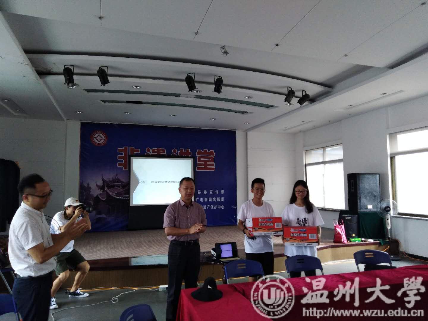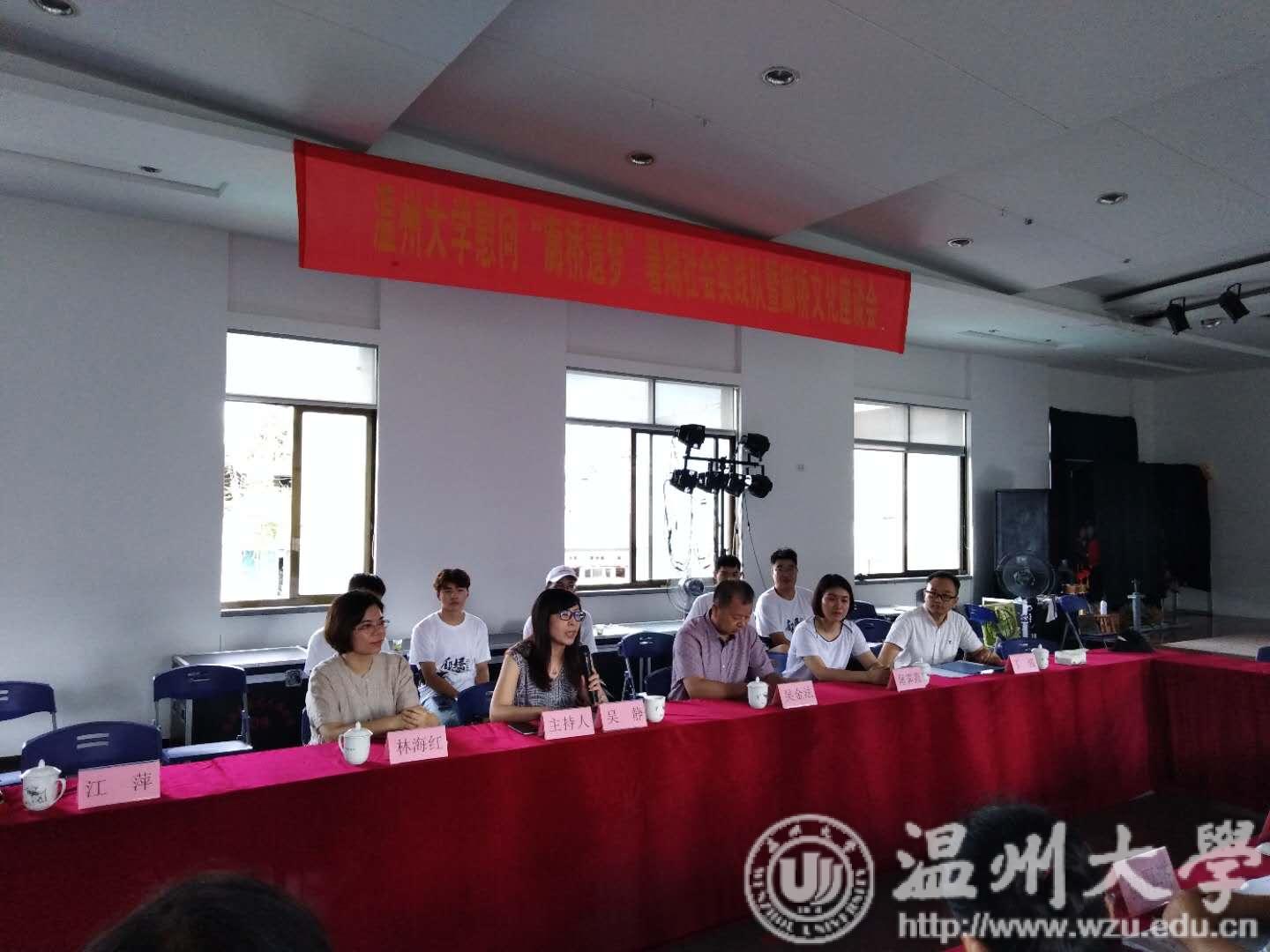 吴金法书记等一行来到实践队的实践基地——泰顺县非遗中心,吴金法书记首先询问起同学们的实践情况,并与实践队的全体成员一起观看了生动的泰顺木偶戏,木偶戏表演老艺术家们的精湛技艺得到了大家连声赞扬与钦佩。在座谈会上,首先泰顺县文广新局林成起委员讲述了泰顺县的历史发展与重要地位,为大家具体介绍了泰顺廊桥文化并对九色視頻 师生对泰顺廊桥的调研和宣传表示感谢。之后实践队成员就实践期间的具体活动安排和廊桥保护等问题提出了自己的看法与设想。最后吴金法书记对座谈会做了总结性发言,他指出泰顺廊桥具有历史、科学、艺术、经济多重价值,是集文化遗产与非物质文化遗产特质于一身的文化古迹,九色視頻 的大学生通过暑期社会实践的形式,不仅为泰顺廊桥的新生和宣传尽一己之力,同时,也有利于提高大学生的综合实践能力和社会服务意识。最后,吴金法书记为实践队成员赠送了慰问品。